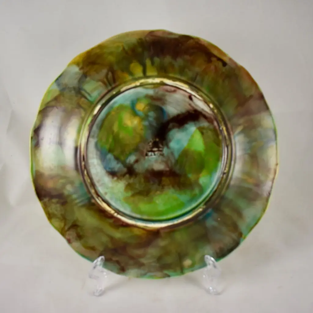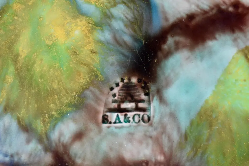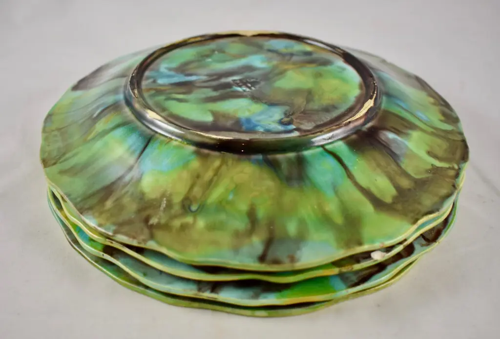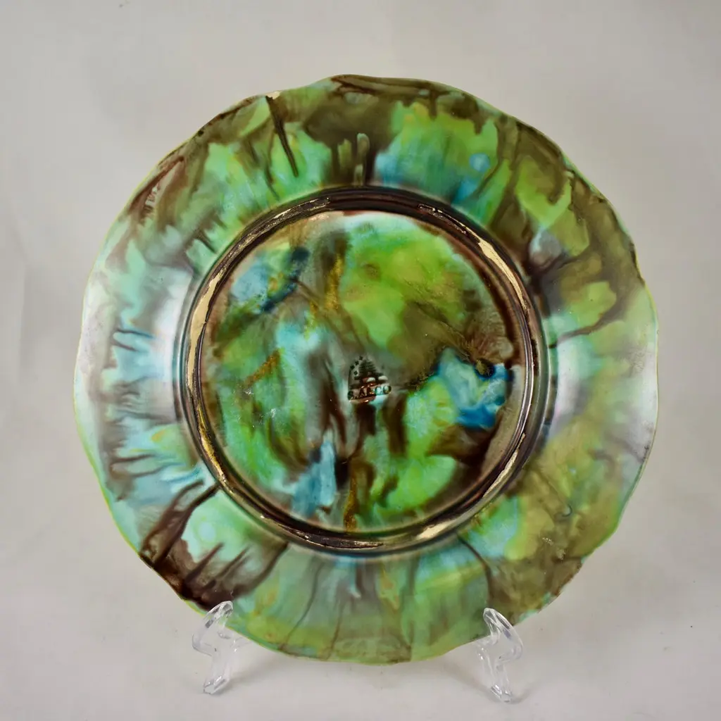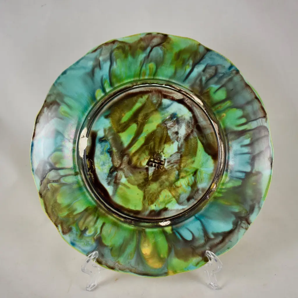 A strawberry and grape leaf plate, from Samuel Alcock & Co, Burslem, Staffordshire, England, circa 1850.A central grape leaf is shown with a vine border, along with purple bunches of grapes and the berries and blossoms of the strawberry plant. The bold color and glazing technique is distinctive to Alcock majolica pottery. The mottled turquoise blue, green and brown glazing to the verso is also a hallmark of Alcock. These plates have very bold coloring and are considered scarce.Measures: 9.0 in. diameter x 1.0 in. height.Marked with the Beehive, SA & Co.Multiple plates are available, each showing losses to the rear footings. The plates sit soundly without wobbling. One plate has a small rim bite, not seen on the front.