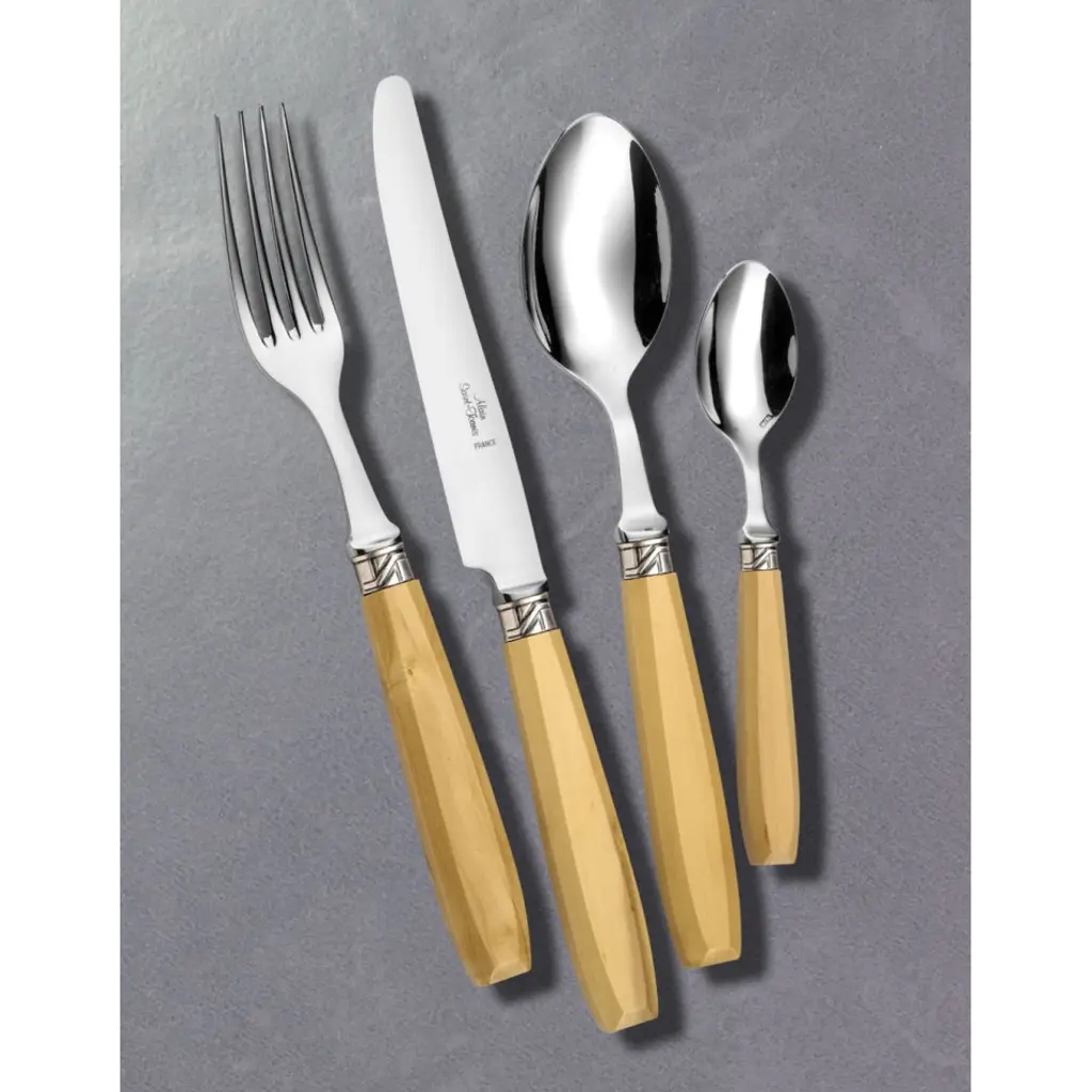 These items made from natural materials and may be variable in appearance. Alain Saint Joanis is a family-owned company that has been creating and manufacturing fine flatware in the purest tradition of French cutlery since 1876. These top-of-the-line collections are made with the finest quality silverplate and 18/10 stainless steel, with handles handcrafted from authentic, raw materials such as exotic woods, resins and enamels. All Alain Saint Joanis flatware is hand-assembled and hand-polished in France, and is dishwasher safe. Five-piece setting includes dinner knife, dinner fork, salad fork, soup spoon, and tea spoon.