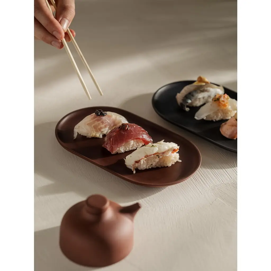The Sand Secrets plate by Design House Stockholm is made of high-fired stoneware. You can use the oval plate for serving cheese or sushi, but the simplified plate also finds its place outside the kitchen: it can be used as a tray for cosmetics jars in the bathroom or small decorative objects in the hallway. Carina Seth Andersson designed the original Sand tableware for the restaurant NM& at Stockholm’s Nationalmuseum as part of the museum's renovation project. The Sand Secrets collection complements the original dishware with bowls and pots — in this tableware, the focus is not just on the dishes but also on the secrets beneath their lids.