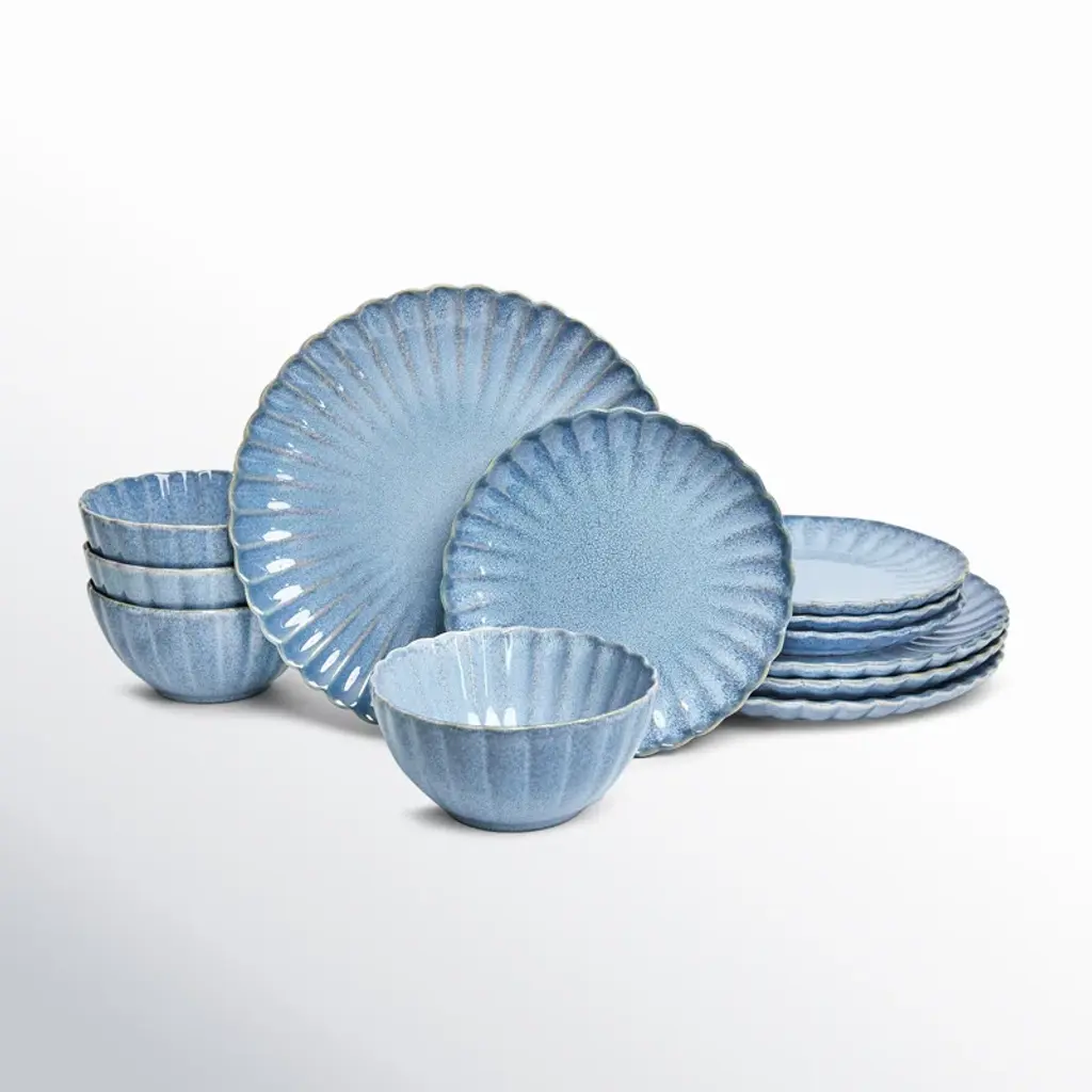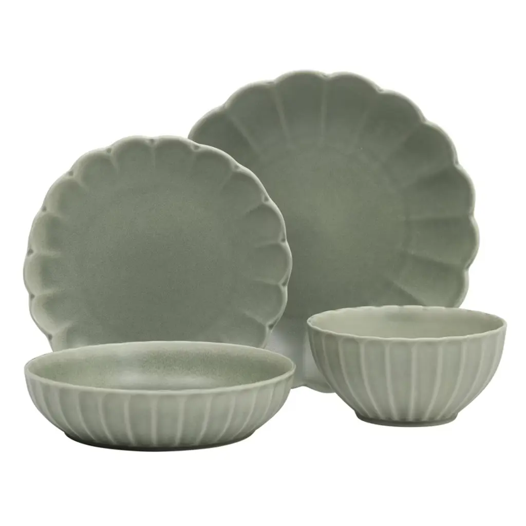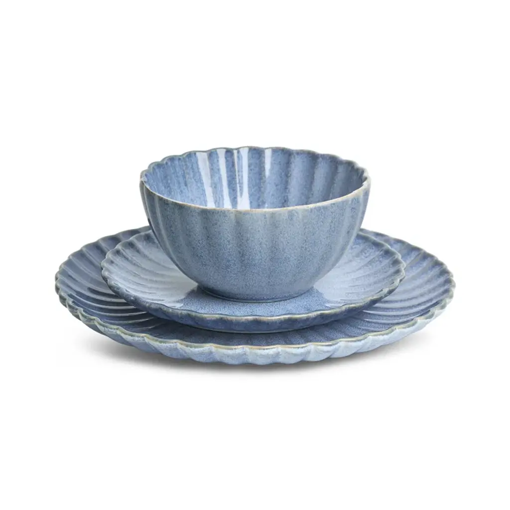 This scallop shaped dinnerware set brings a vintage French aesthetic to your dining table. The romantic style of these fluted shapes, combined with the reactive glaze, makes no two pieces exactly the same. Style these artisanal pieces with favorite teacups, dessert plates, and serving pieces, to give your upcoming dinner party or family gathering a very bohemian mix-and-match look.