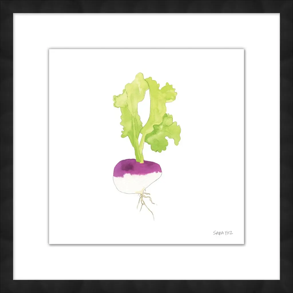 This giclée print of a painterly radish is ideal for adding color and charm to a kitchen, breakfast room, or den. Floated on a white mat within a wood frame, it arrives ready to hang.