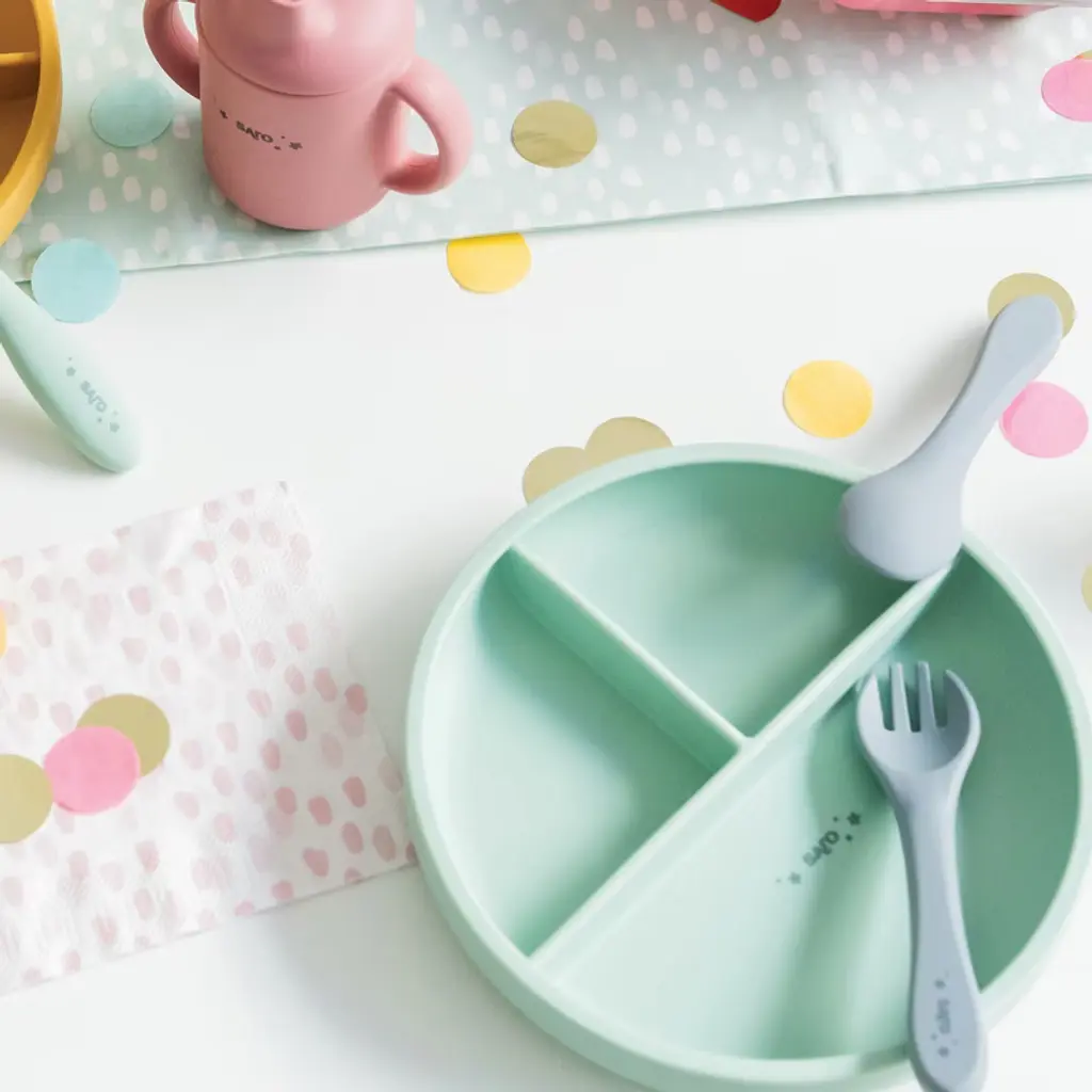Saro "Food & Fun" 3-compartment Silicone Plate - Mint: Suction Base, Toddler Feeding Plate For Blw
