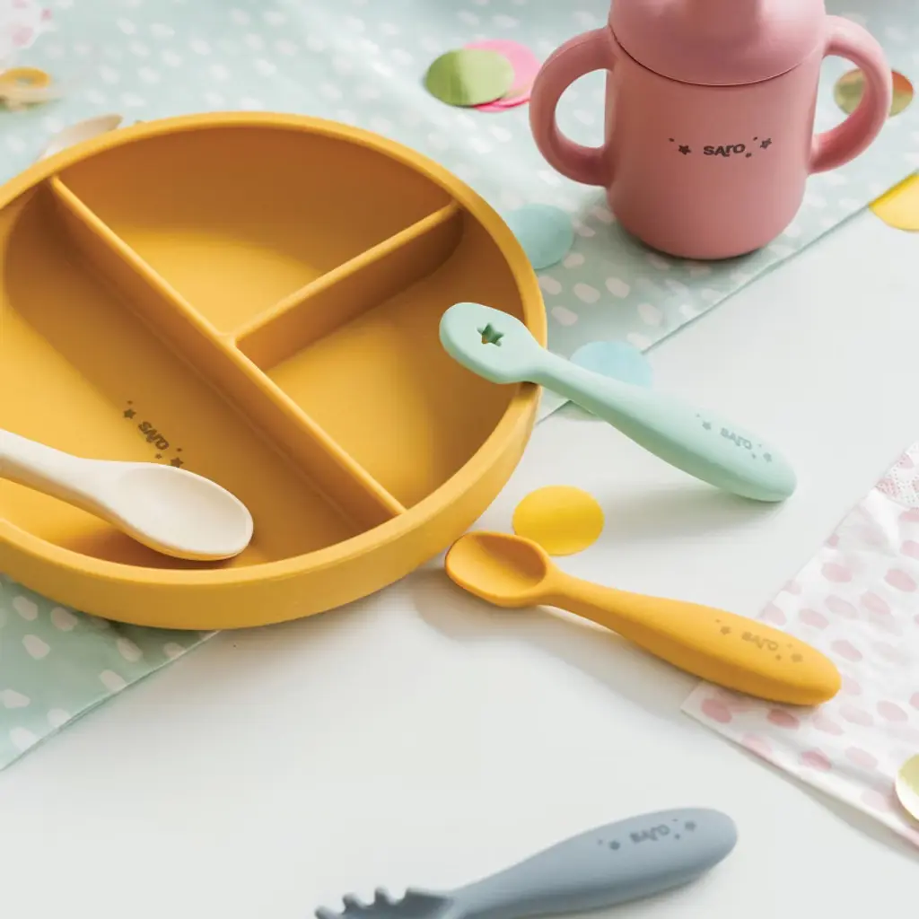 Brighten up mealtime with the SARO "Food & Fun" 3-Compartment Silicone Plate in Mustard. This cheerful plate is made from 100% premium food-grade silicone, providing an eco-friendly, antibacterial, and incredibly resilient surface for your little one's meals. It features three organized sections and a powerful suction cup base to keep the plate securely on the table, perfect for baby-led weaning and minimizing messes. The raised edges ensure food stays put. This durable mustard plate is also incredibly convenient, being both microwave and dishwasher safe for quick preparation and easy cleanup, fostering your child's independence.