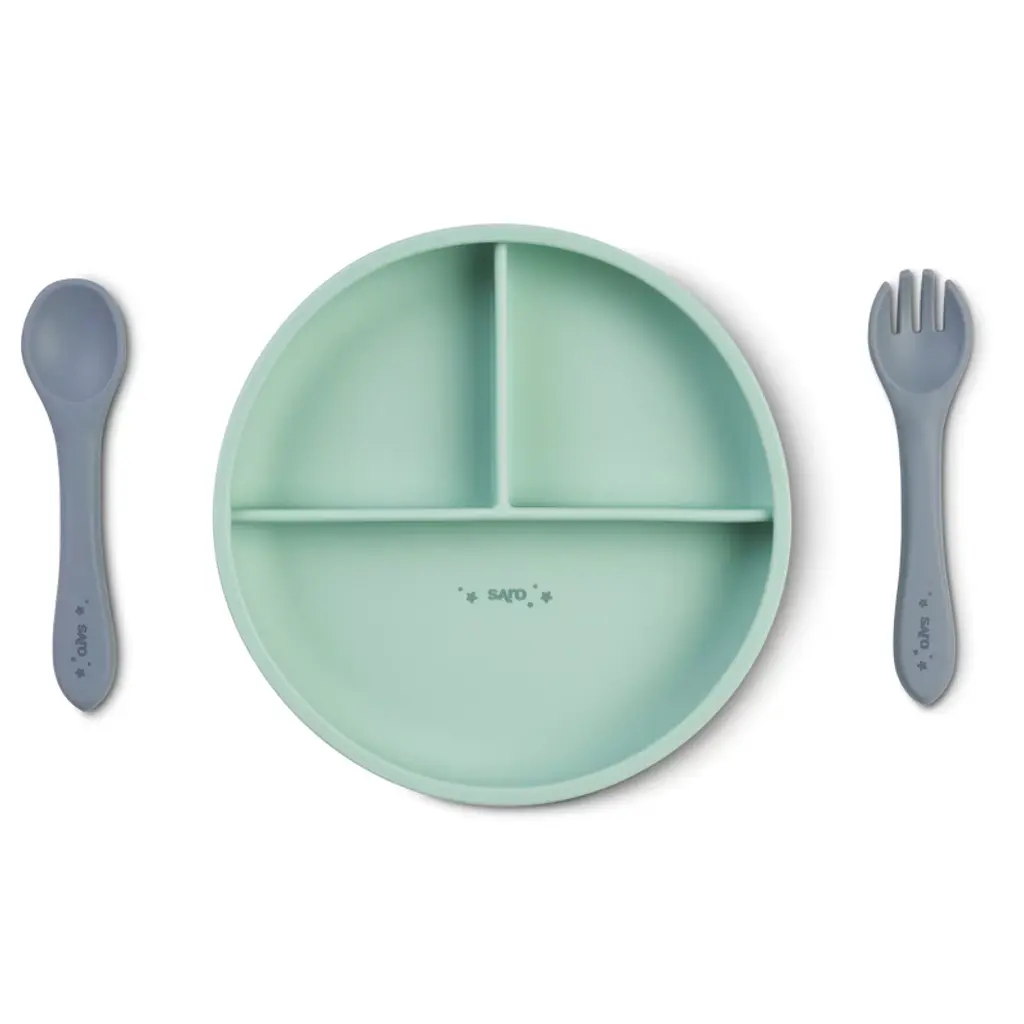 Saro "Food & Fun" 3-piece Silicone Baby Feeding Set - Blue Mist + Mint: Suction Plate, Spill-proof Cup & Utensils For Toddler Self-feeding