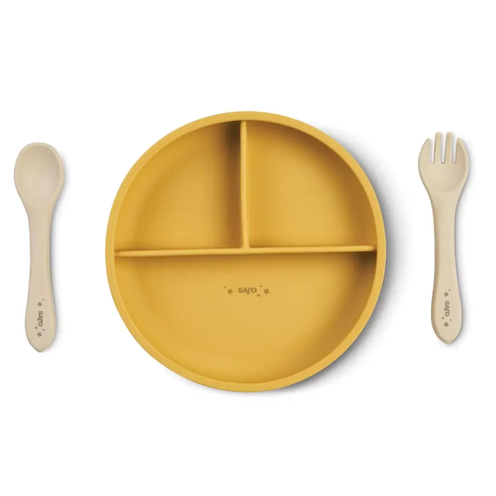 Saro "Food & Fun" 3-piece Silicone Baby Feeding Set - Mustard + Sand: Suction Plate, Spill-proof Cup & Utensils For Infant Self-feeding