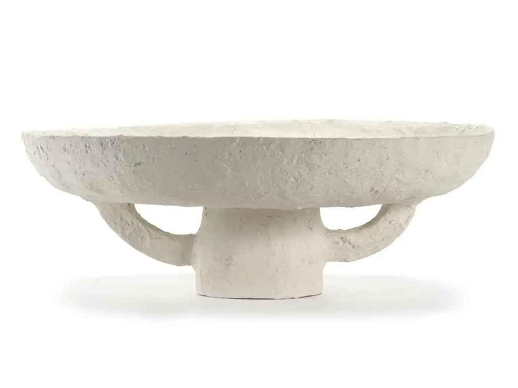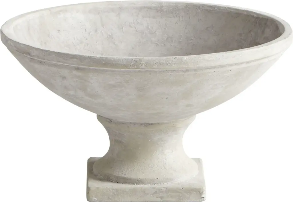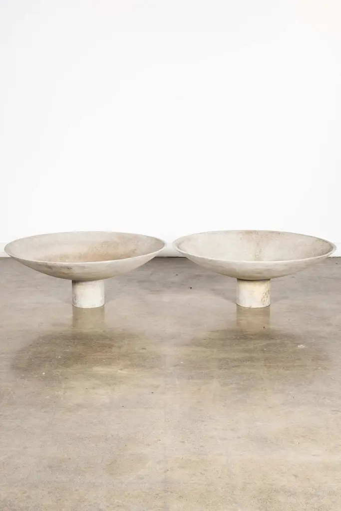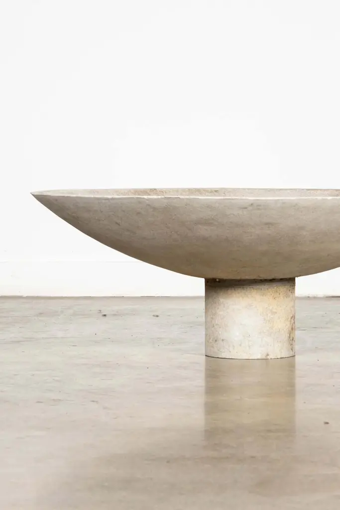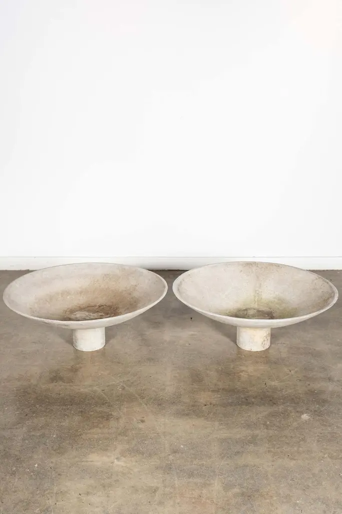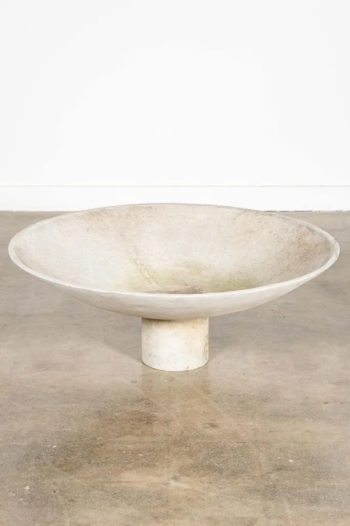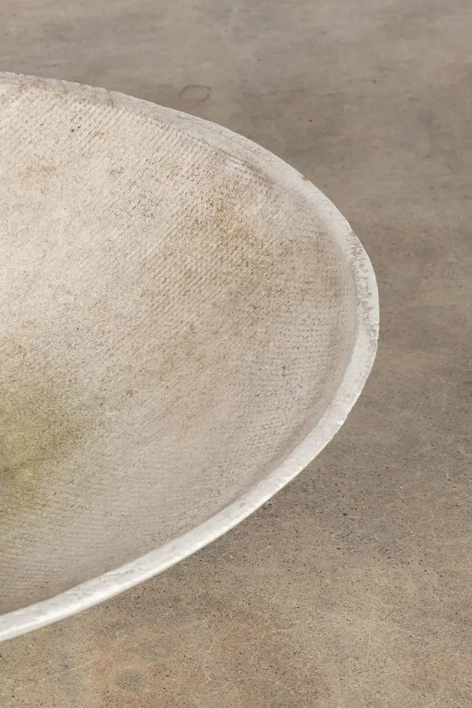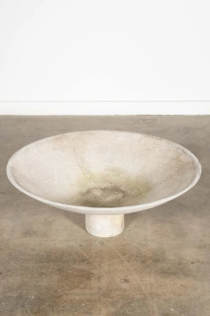 The large concrete composite saucer planter by Swiss architect Willy Guhl, provides a wide, low profile base for arrangements. Sculptural and suitable for indoor or outdoor use.overall: 14.25"H - 37.5"diameterbase: 6.75"H - 8" diameter