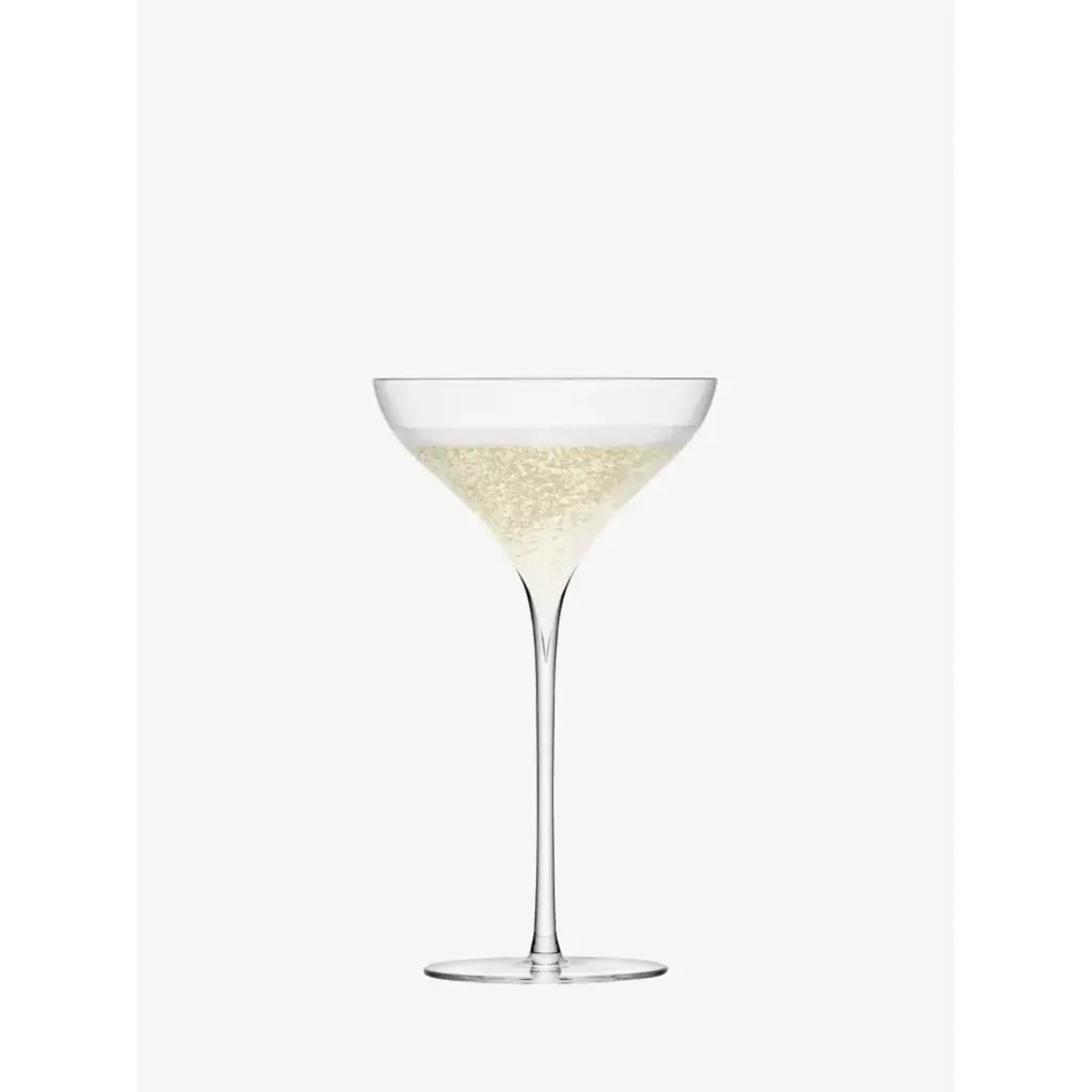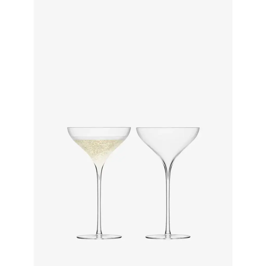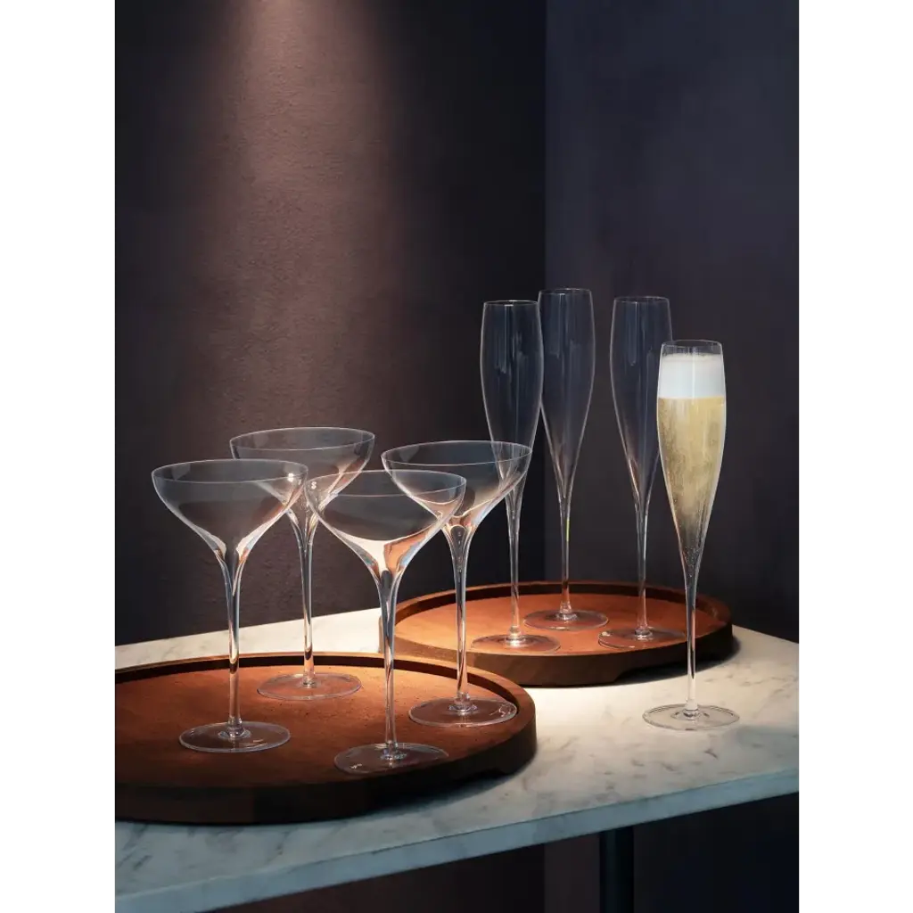 Mouth-blown champagne saucers with fine bowls hand-drawn stems.