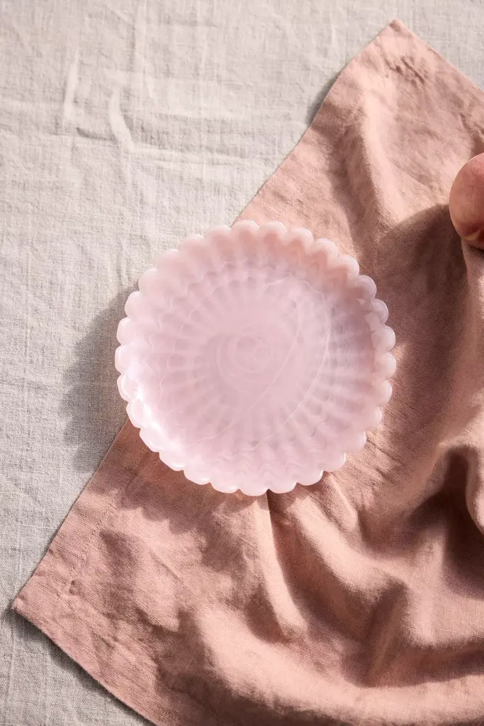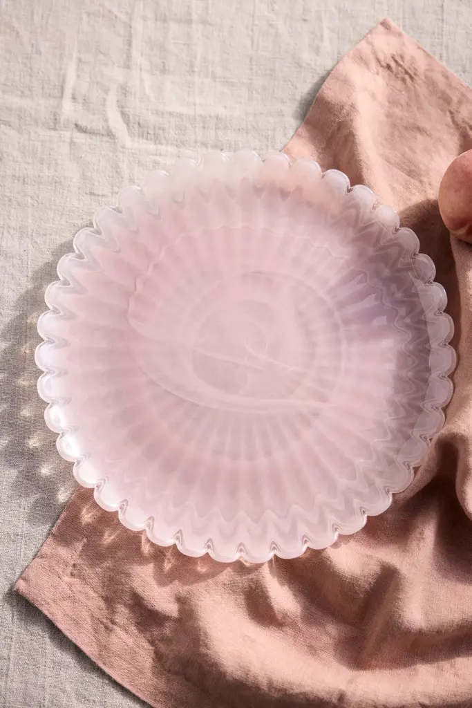 A dainty scalloped edge and rose-tinted glass make this plate a charming way to serve your favorite sweet or savory treats.