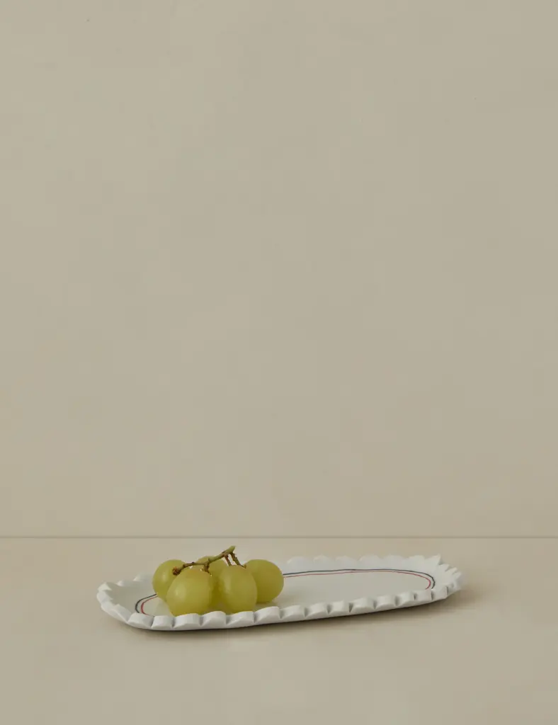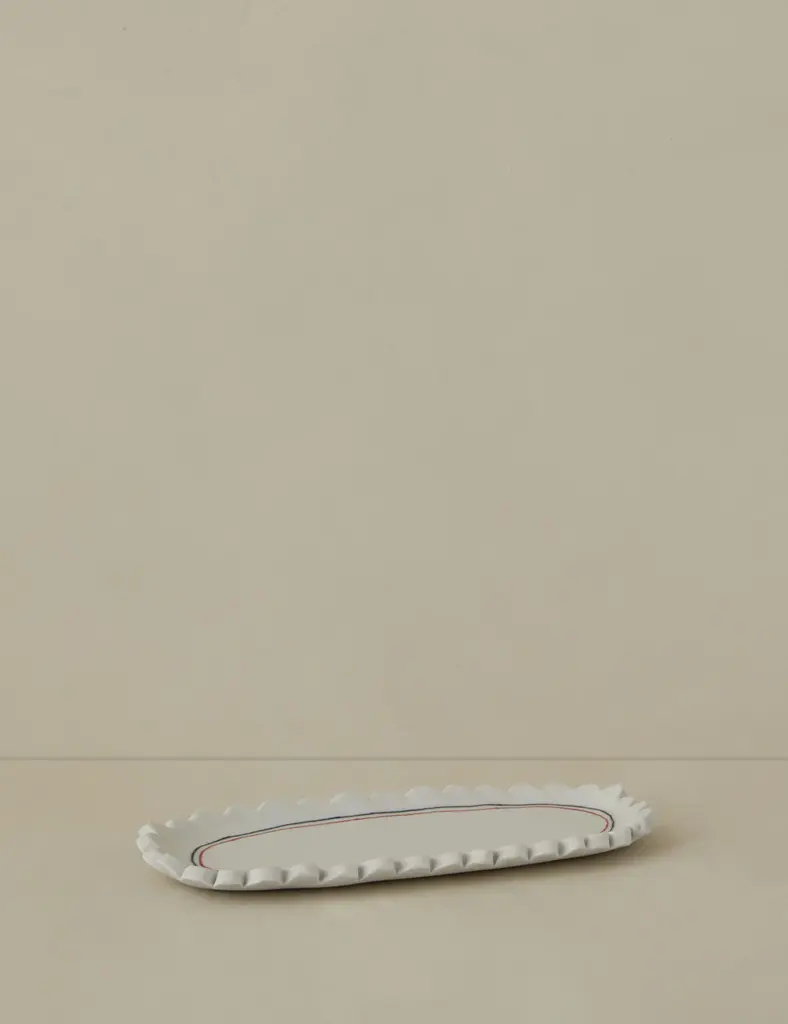 Los Angeles-based ceramicist Stephanie Dawn Matthias's work recalls the traditions of European folk art in small-batch, luxury ceramicshandcrafted and hand-painted to bring a timeless touch to modern interiors. The scalloped serving dish features a classic two-tone trim that inspires a continental air. It is dishwasher-safe, letting you bring an artisan touch to any table.