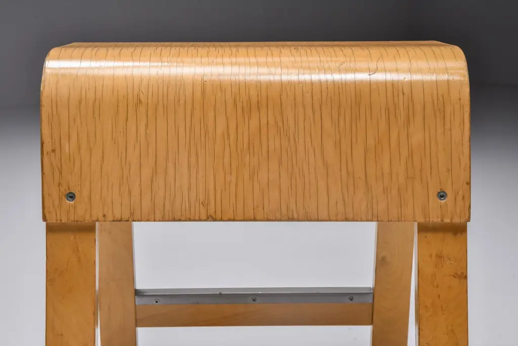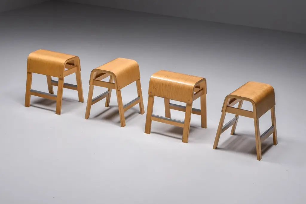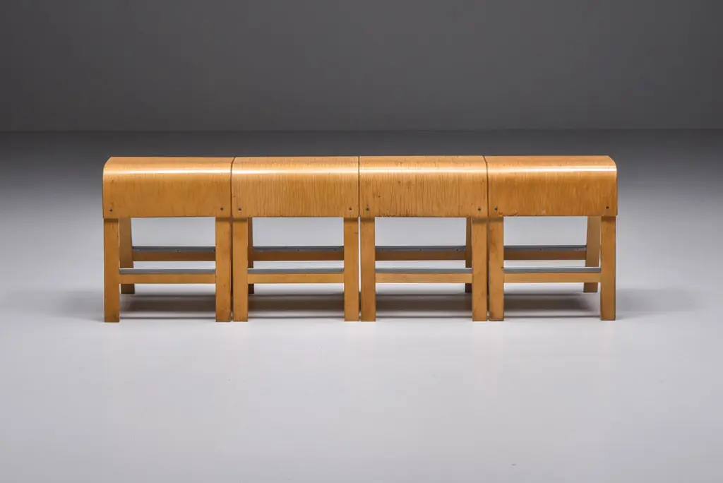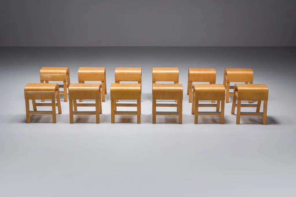Ikea manufactured wooden stools. A great piece of Swedish Mid-Century Modern design. Perfect for a dining area or office space where the number of seats change from day to day. Can be placed next to each other to function as a bench. We have twelve of these stools available for purchase.