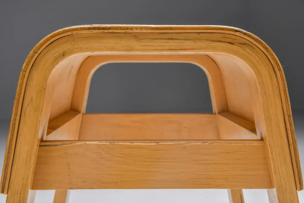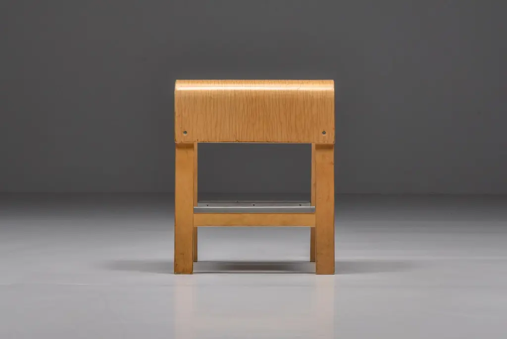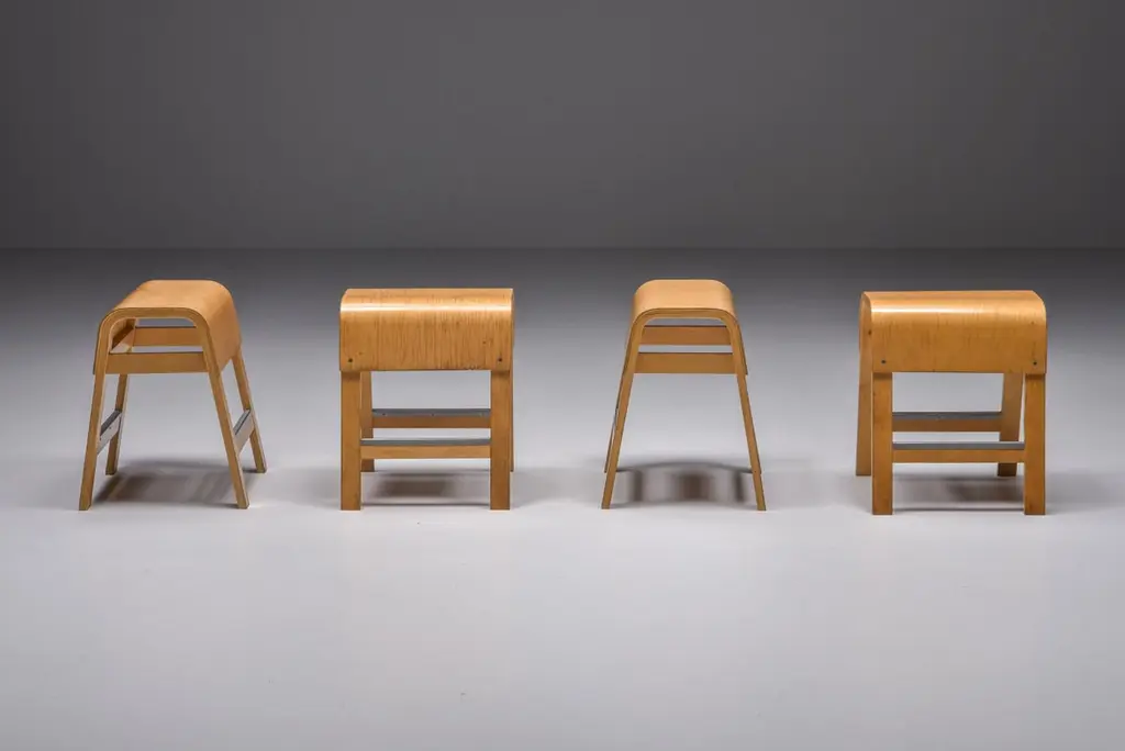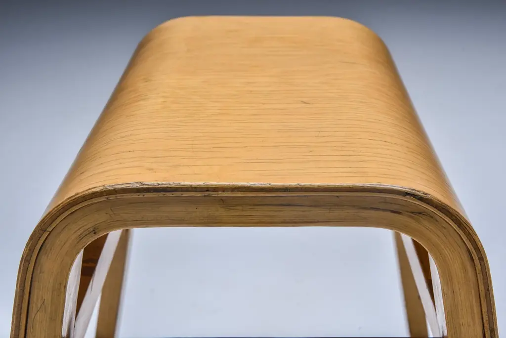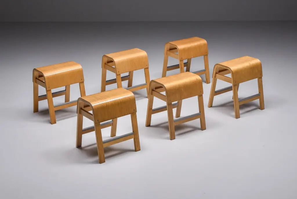 Ikea manufactured wooden stools. A great piece of Swedish Mid-Century Modern design. Perfect for a dining area or office space where the number of seats change from day to day. Can be placed next to each other to function as a bench. We have twelve of these stools available for purchase.