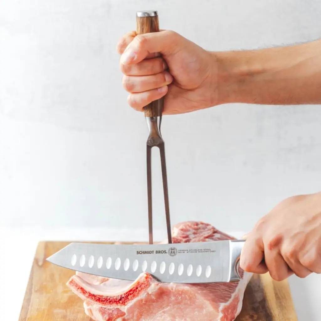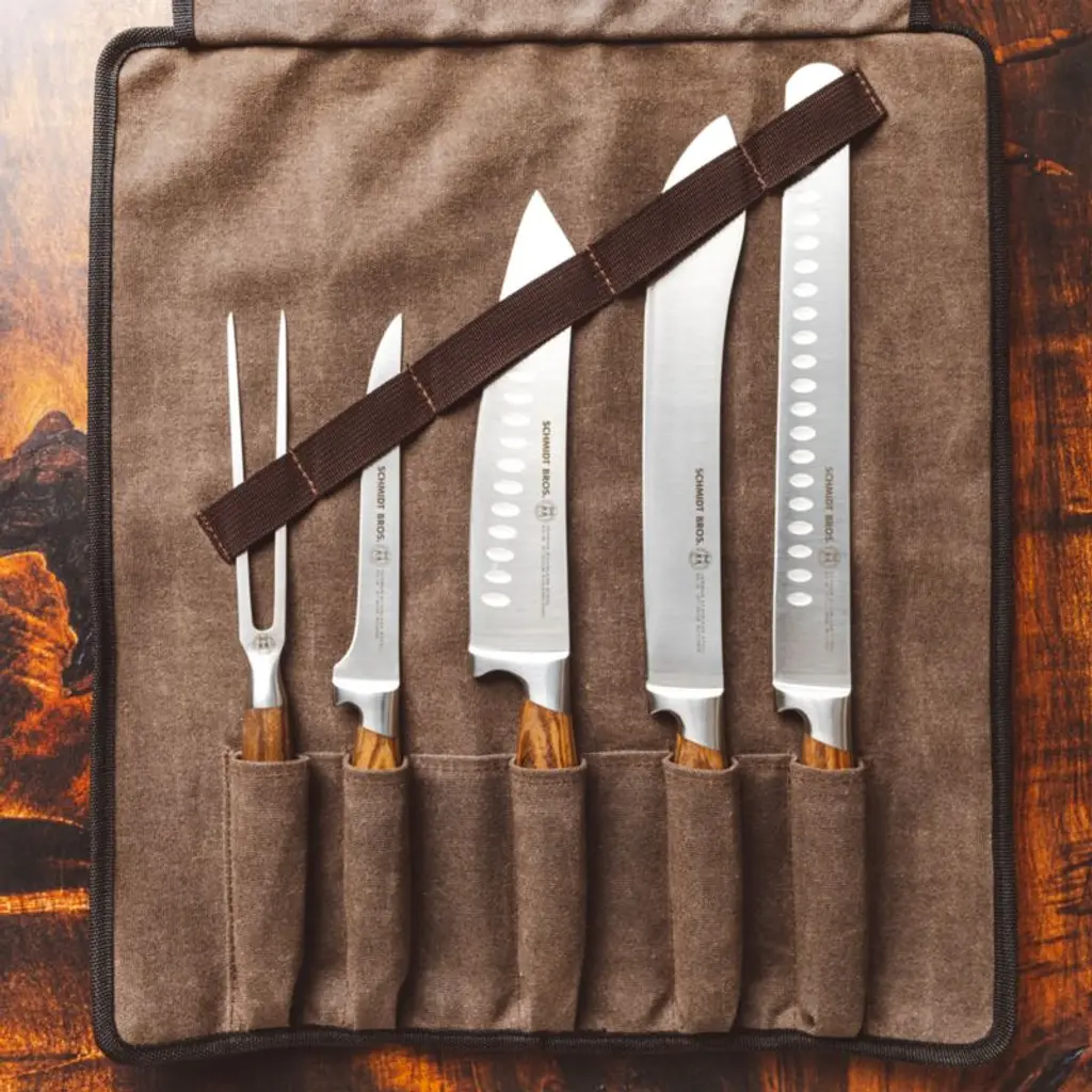 Striking zebra wood handles make for a stunning set of knives curated for barbecue enthusiasts and grill masters. Protected by microfiber-lined storage sheaths and presented in a handsome waxed canvas carrying case, the four knives plus carving fork ably handle meats, poultry, fish and vegetables. Carefully balanced and weighted ergonomic handles provide precise control of the ultra-sharp stainless steel blades. An exceptional housewarming, graduation or wedding gift, this set includes an 11-inch slicing knife, 10-inch butcher knife, 8-inch chef's knife, 6-inch boning knife, storage sheaths for all knives, 6-inch carving fork and carrying case. Need help choosing? Here's your essential guide to choosing the best knifeView all Schmidt Brothers Knives
