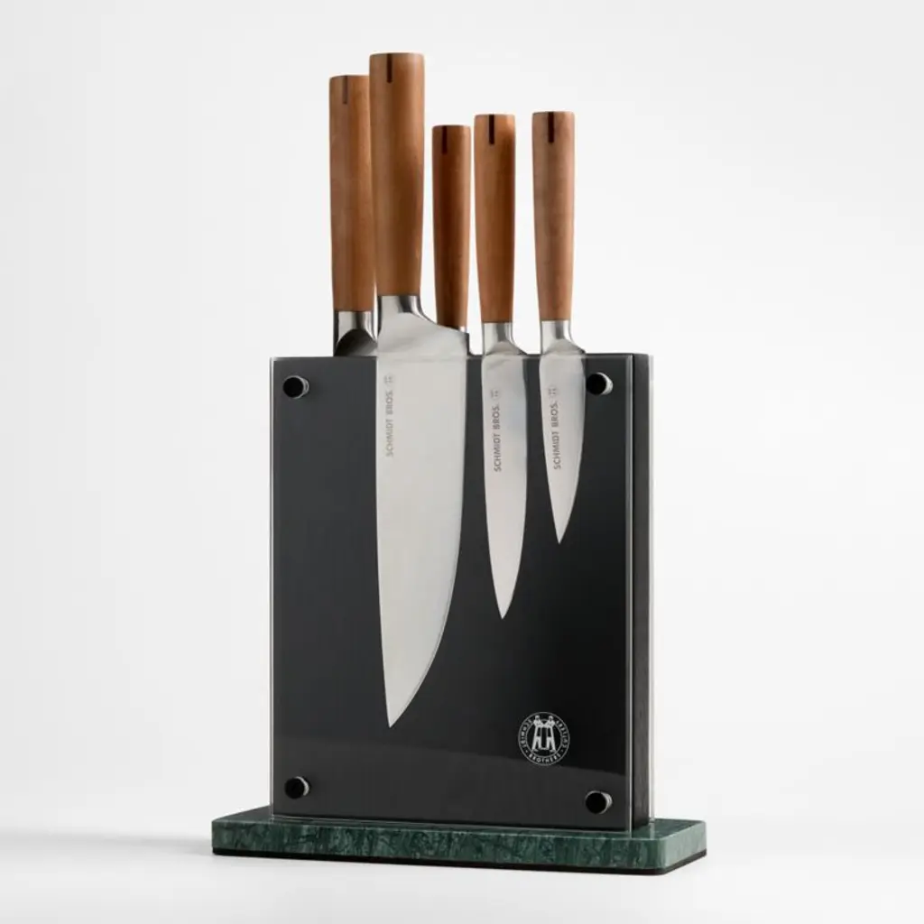 Daniel Humm designed this Schmidt Brothers cutlery set with quiet but intentional details to elevate every kitchen (and cutting task). Coordinating with other pieces in his exclusive Crate & Barrel collection, green marble provides a stunning base for the ebonized wood knife block fitted with clear acrylic panels that provide a view of the knives. Stainless steel blades join wooden handles with impeccable joinery that showcase the high contrast between the woods and let the natural material shine. Illustrating how something so simple can be so beautiful, the six-piece knife block set elevates essential tools into a display-worthy statement piece.Our collaboration with Daniel Humm, chef-owner of Eleven Madison Park and Clemente Bar in New York City, is a celebration of simplicity, beauty and function for the table and beyond.