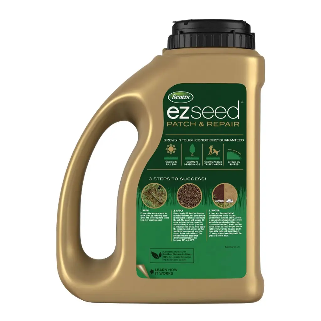 Scotts® EZ Seed® Patch & Repair Bermudagrass is a revolutionary grass seeding product designed to fill in bare spots on your lawn. This Bermudagrass seed grows in tough conditions, including scorching heat, dry areas, high-traffic areas and on slopes. Scotts® EZ Seed® Patch & Repair consists of high performance grass seed, continuous release lawn food, and super-absorbent growing mulch material. Scotts® EZ Seed® Patch & Repair Bermudagrass also includes a tackifier to help reduce seed wash-away and a protectant to help keep seedlings safe from harmful diseases. There are three easy steps to success: 1) prep the area by removing dead grass and loosening hard soil, 2) evenly apply EZ Seed® so the area is mostly covered but bare ground is still visible, and 3) saturate with water until no more water is being absorbed and mulch turns dark brown. Plant when daytime temperatures are between 70°F and 90°F with no danger of frost. For best results, water when mulch turns light brown to keep the soil surface moist until the seedlings reach at least 2 inches tall.