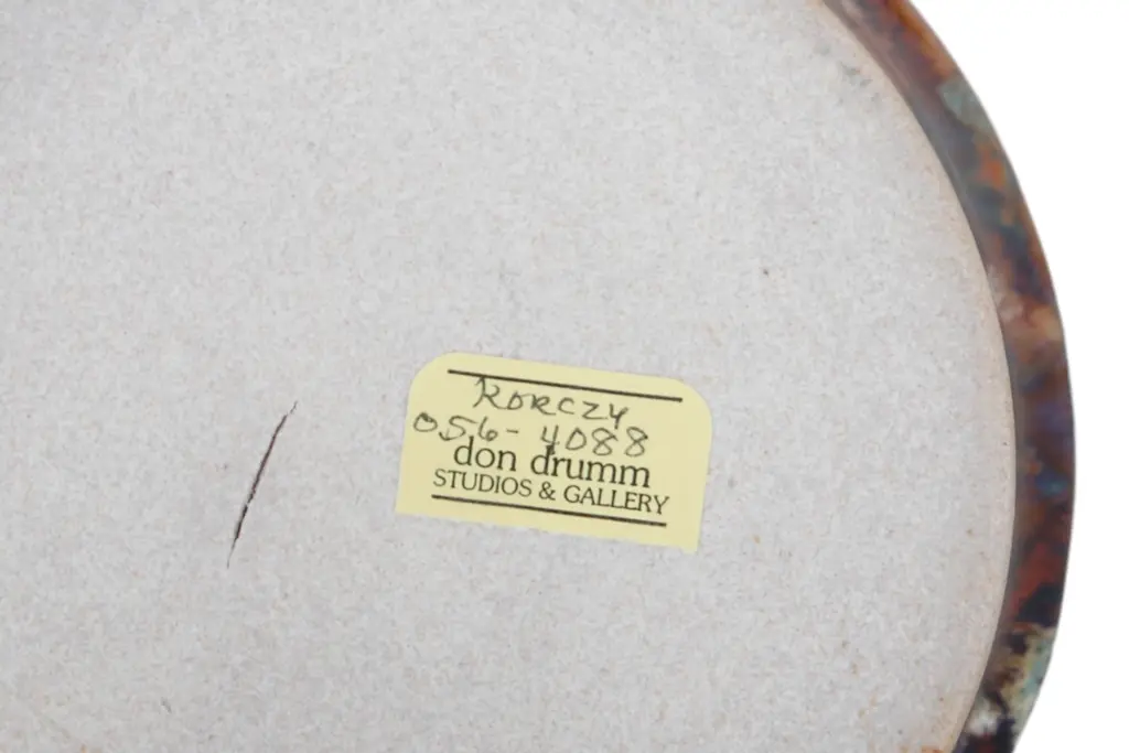A pair of matching sculptural drip glaze stoneware mugs hand-made by artist and ceramicist Ron Korczynski. Barrel like exteriors are ribbed with four bands for a comfortable hand hold, and decorated with browns, purples and blues. Signed underneath with a “K”, and labeled Don Drumm Studio & Gallery.