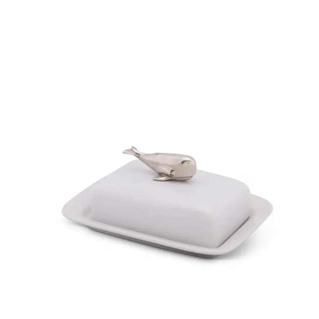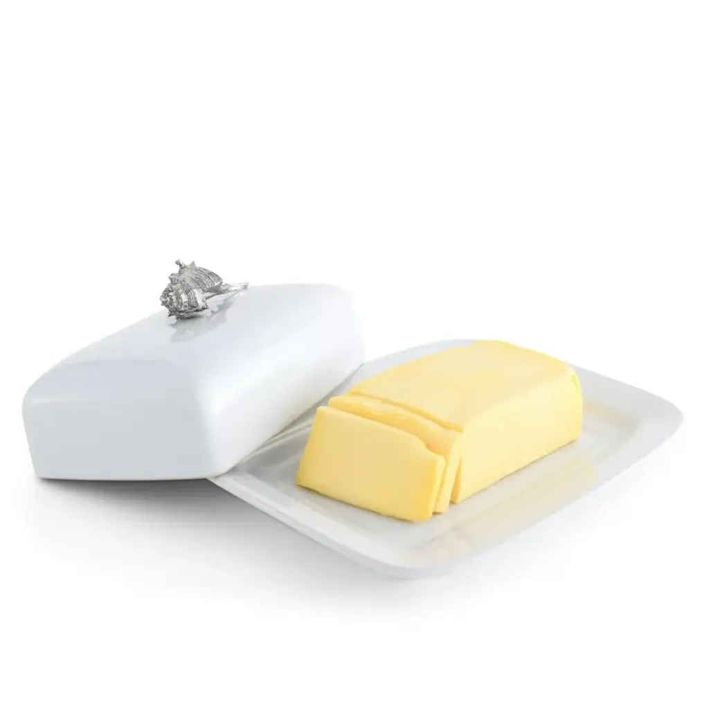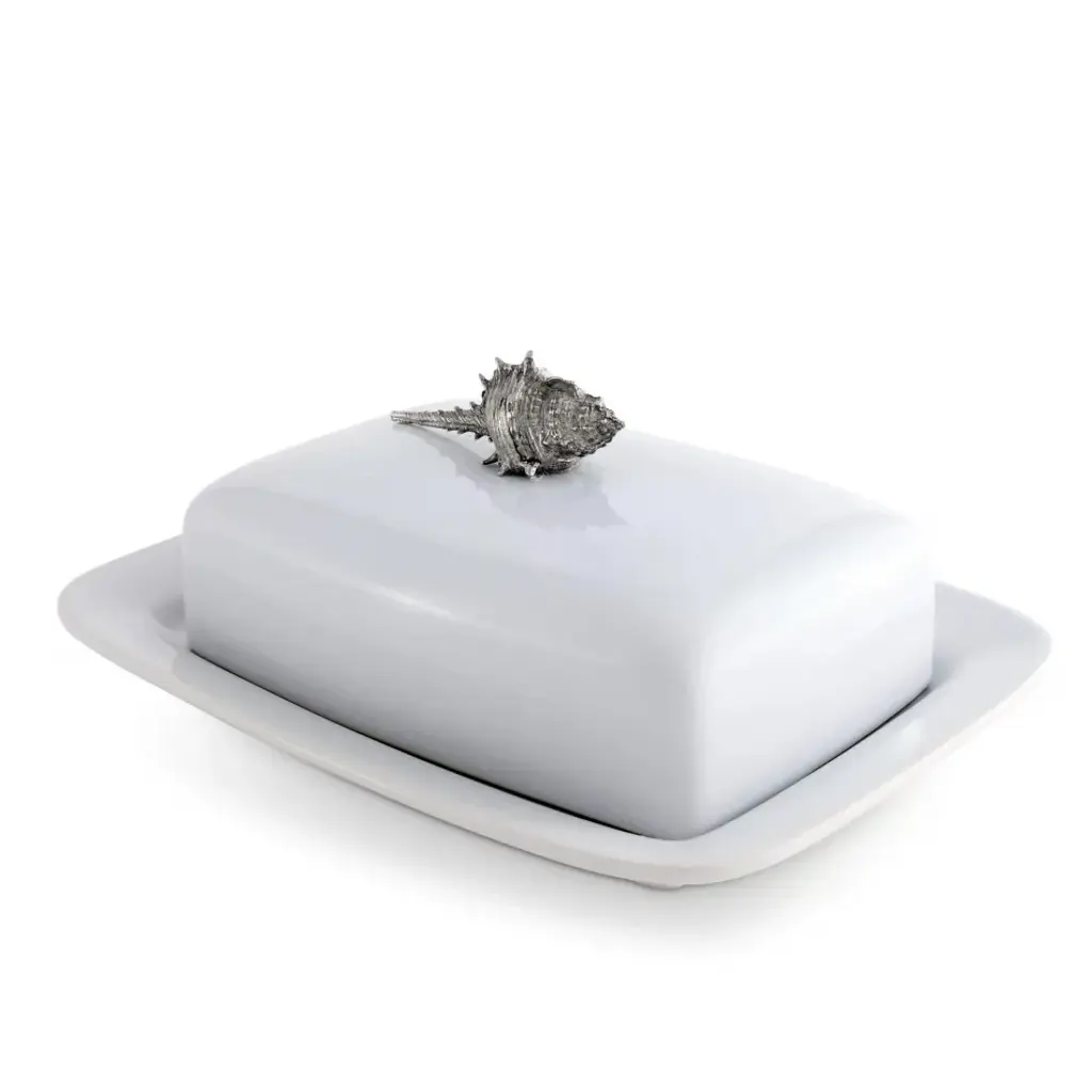 Vagabond House’s fine stoneware butter dish is deep glazed to a lustrous warm white finish and topped with silvery, pure pewter, highly detailed Conch Shell finial. Designed with gourmet kitchens in mind, the dish is sized to hold standard butter sticks of 227 grams (8 oz.). 1 or 2 Eastern U.S. or Western U.S. 4 oz. sticks will also fit comfortably Vagabond House is a family-owned American company specializing in fine pewter tableware, servingware and giftware. Largely inspired by nature, their exclusive products are designed to be unique, functional heirlooms for those who seek to express tradition and style in both family and formal entertaining.