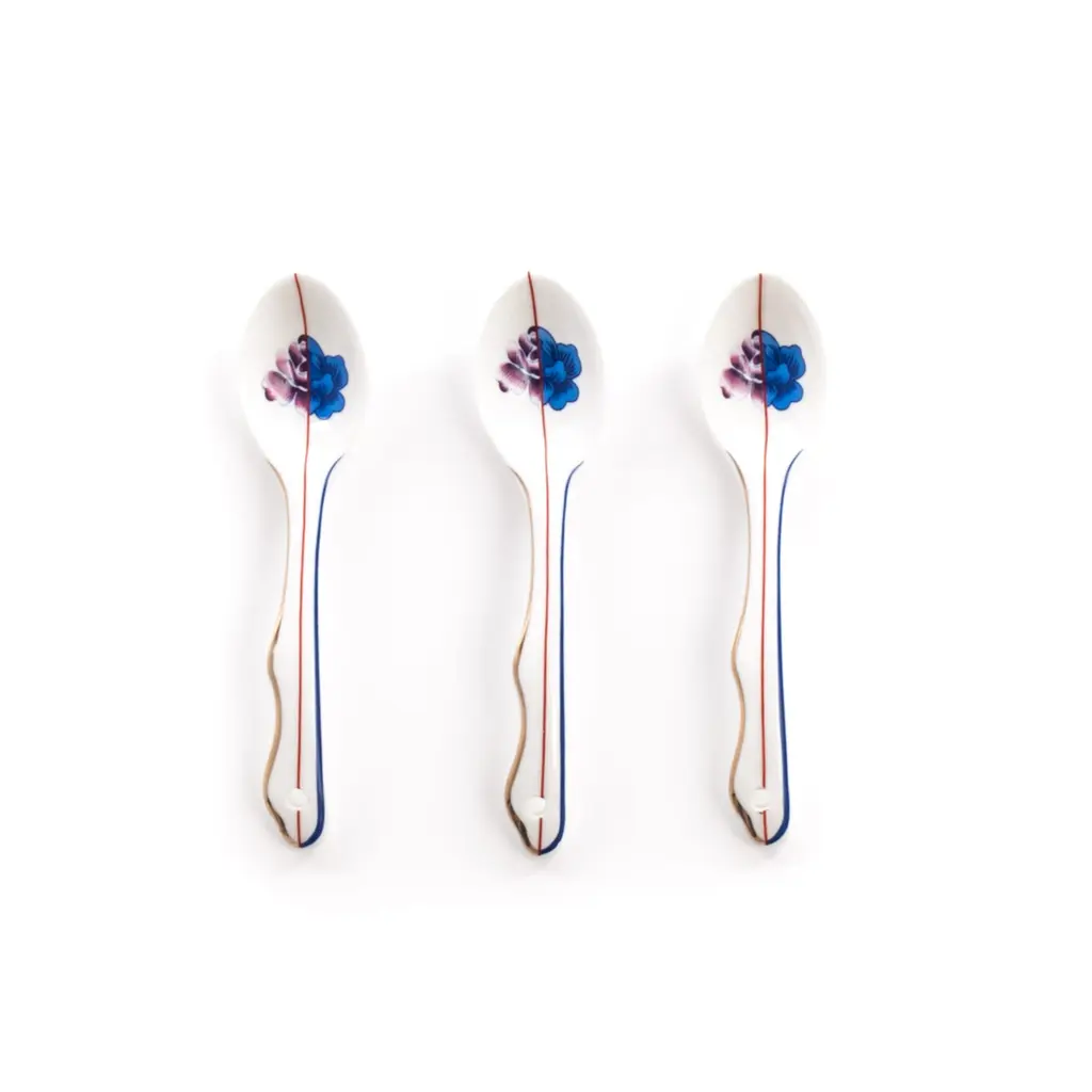 Refined beauty and deconstructed design combine in the creative and simply captivating Hybrid collection designed by CtrlZak. The Armilla set of three coffee spoons illustrates the distinct allure of the series perfectly. A single red line divides each spoon in two, marking the border between Eastern and Western traditional decorating styles that have enhanced porcelain products for centuries. In the middle, a single flower in bloom with blue and pink petals. The gold and blue tones along with the undulating and straight lines of the edges complete the design. You can use these coffee spoons on their own or paired with tea cups from the same collection.