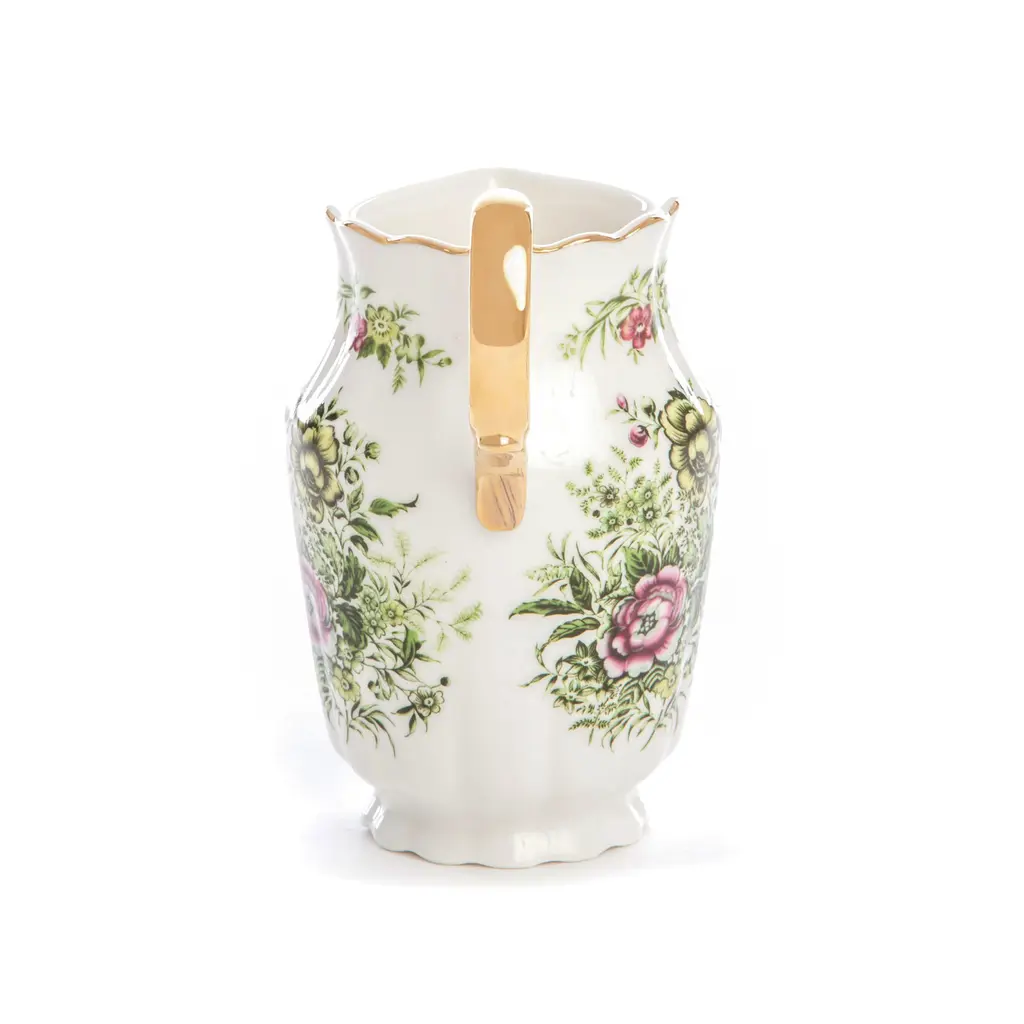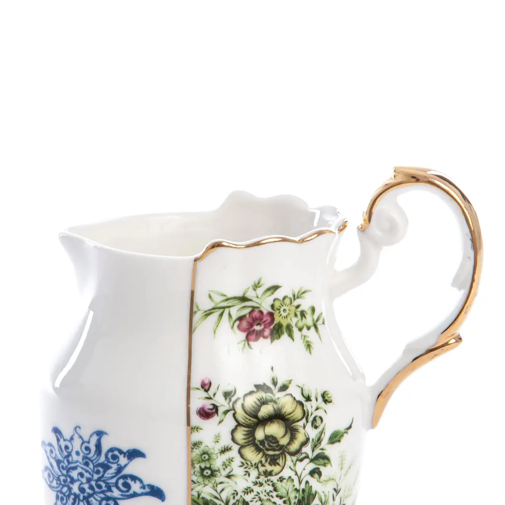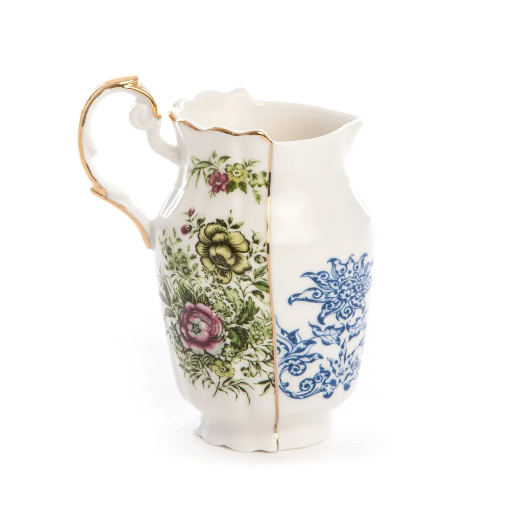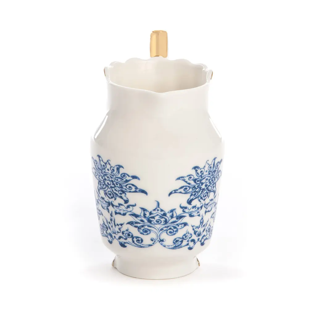 The Berenice milk jug from Seletti’s Hybrid collection captivates at a glance with its intricate, detailed and idiosyncratic design. Created by art and design collective CtrlZak, this bone china milk jug has an artistic appearance that pays homage to East and West porcelain decorating styles in a distinctive way. The two sides feature unique patterns. One boasts highly detailed peonies in muted colors, gold accents as well as an undulating rim and base. The other displays a stylized flower pattern in a beautiful blue color along with a simple, uniformly straight rim. Made from bone china, this Berenice milk jug is premium quality and dishwasher-safe.