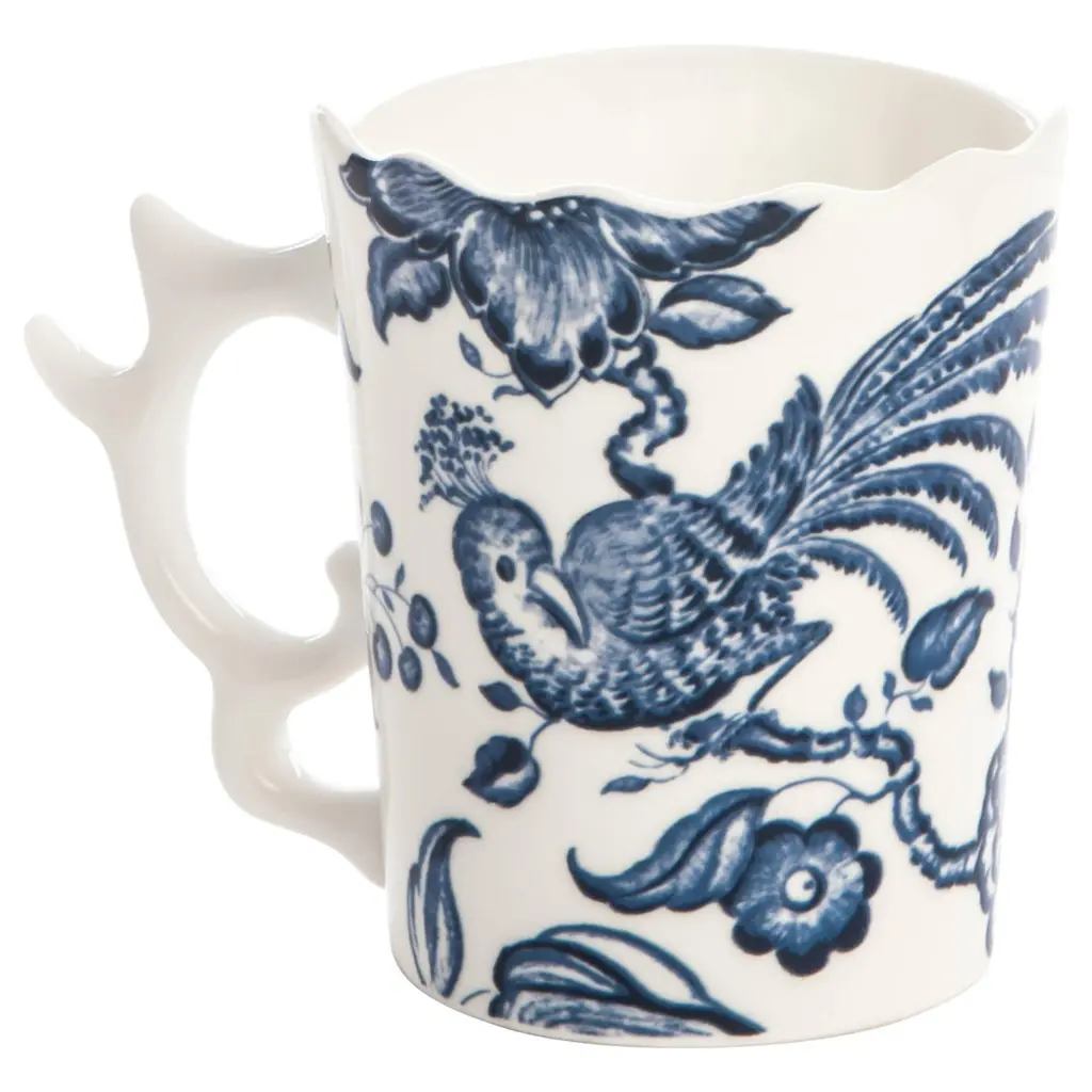 Italian to the bone, the mugs were designed by CtrlZak for Seletti and made of bone china, a material known for its strength, chip resistance, whiteness, and translucency. The bird patterns were each refined by hand in elegant shades of blue. Representing Eastern and Western traditions, the designs come together with a brown seam in the middle and differing heights on either side it. Embracing contrast, the elegant pair brings deconstructed, punk style to coffee and tea.