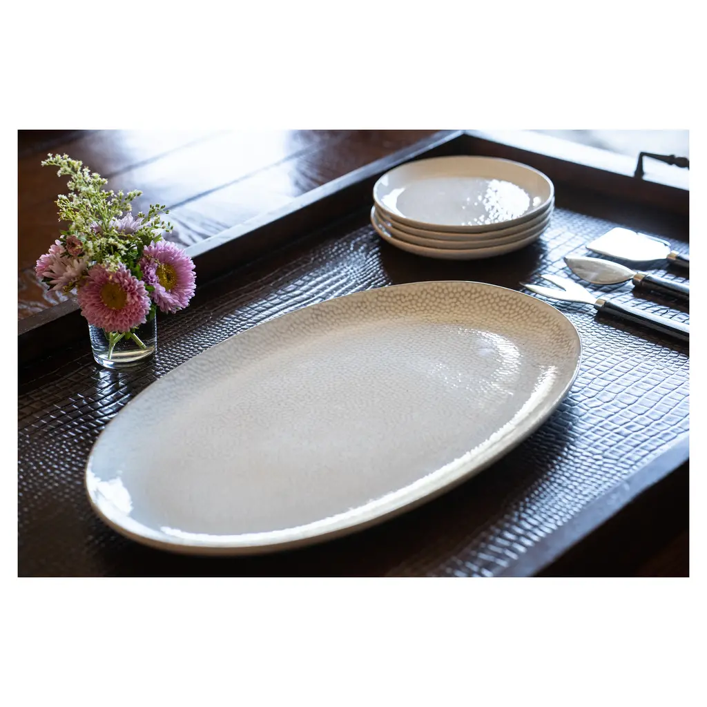 Entertain in style with the BIA Cordon Bleu Stoneware Serene Oval Platter measuring 16.25" x 9.5". Crafted with a unique reactive glaze, this platter imparts a warm, inviting aesthetic to your table setting. Adorned with a graphic, sculptural bead-like texture, it serves as a beautiful canvas for your culinary creations. This piece is not only a standout on special occasions but also durable for everyday use. Dishwasher and microwave safe, this stoneware platter seamlessly combines style with functionality. Elevate your dining experience with the Serene collection from BIA Cordon Bleu – where timeless elegance meets modern sensibility. BIA Cordon Bleu: Designed With Modern Sensibility For Wherever You Live, However You Cook, And Whenever You Entertain.