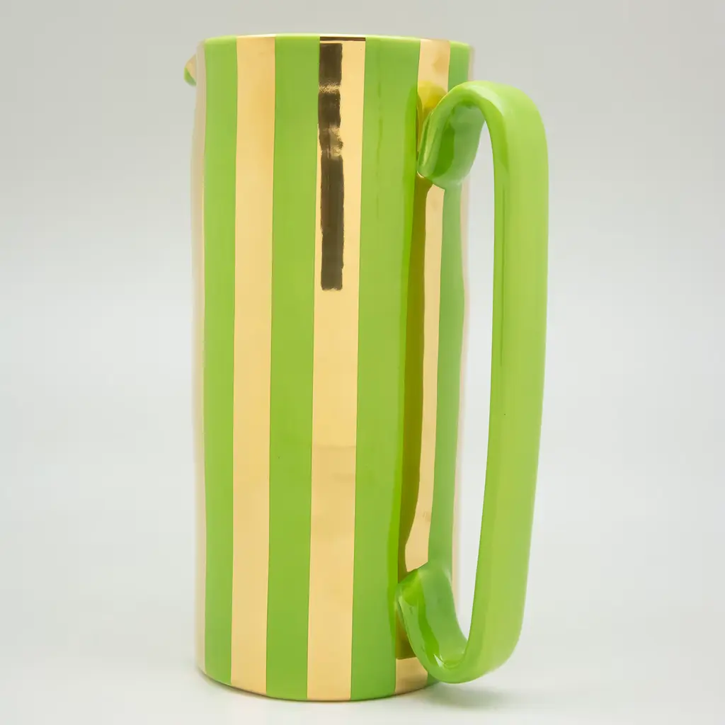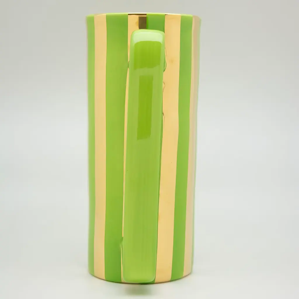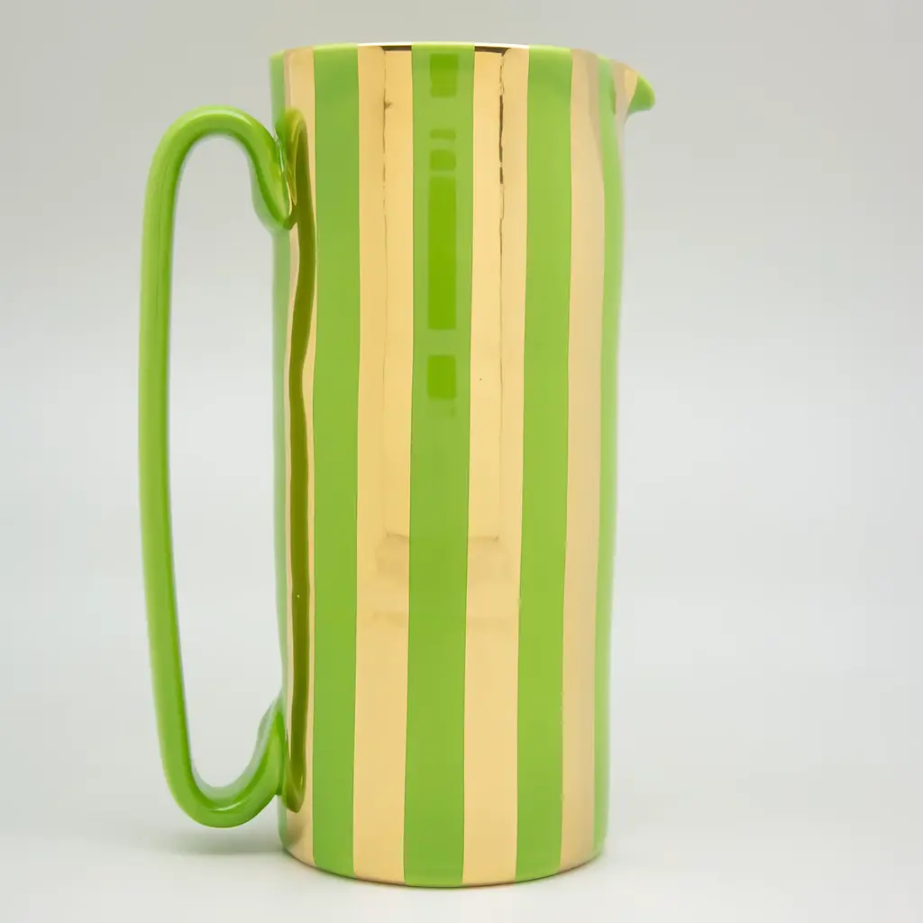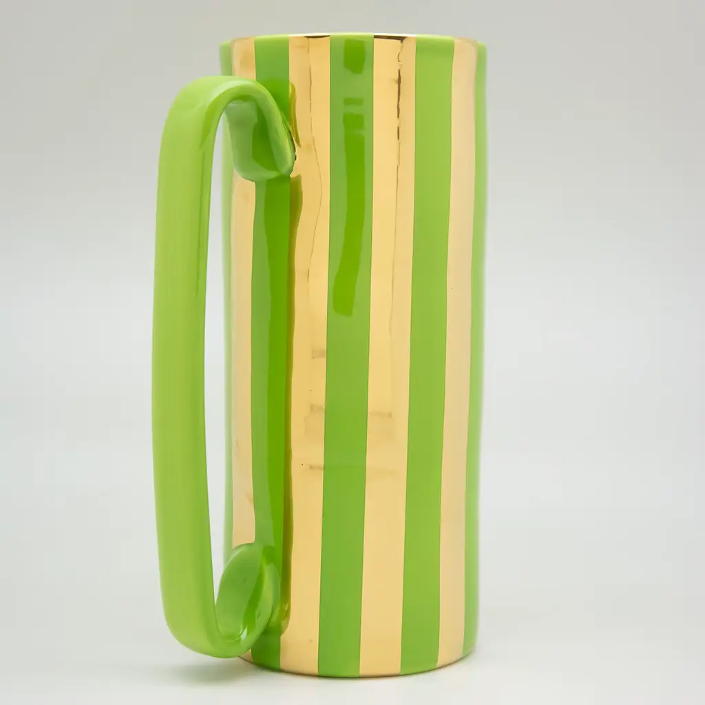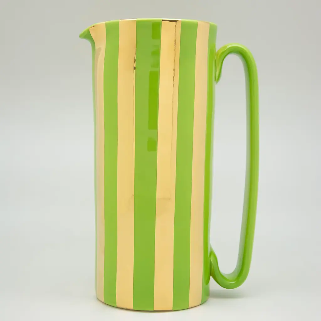 The authentic 24 K Gold 'Mercante' pitcher, is the one and only ceramic carafe with a linear handle. Handthrown in white terracotta, the stunning Serlio Carafe is a beautiful example of fine Italian craftsmanship. Enhance any table with Tuttoattacato's minimalistic design, emphasizing any classic or contemporary dinnerware with its elegant design and quality. Fired multiple times, the 24 K Gold stripes are a result of the traditional 'Terzo Fuoco' technique.
