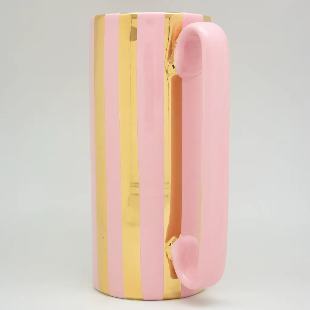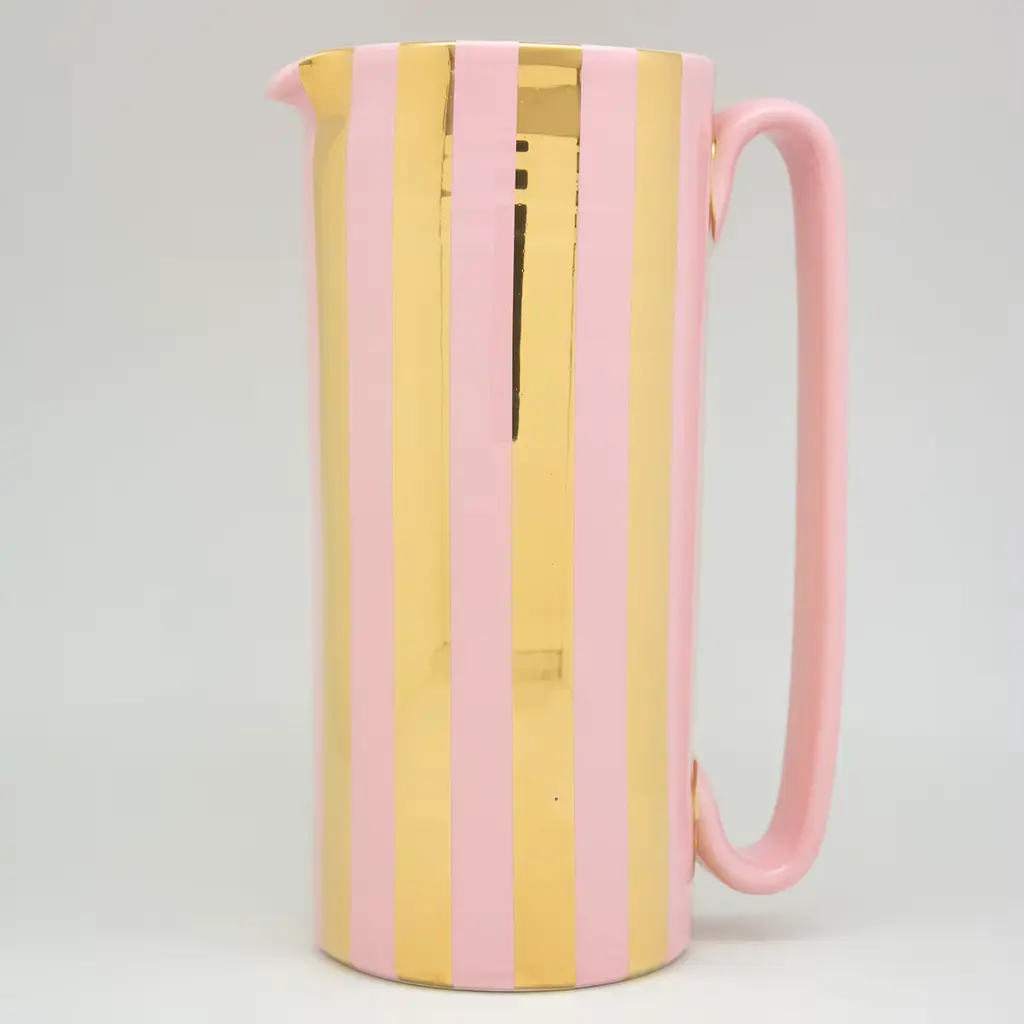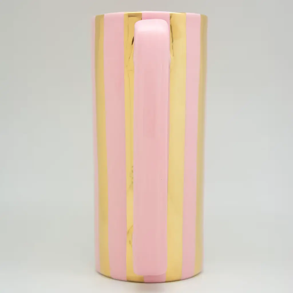 The authentic 24 K Gold 'Mercante' pitcher, is the one and only ceramic carafe with a linear handle. Handthrown in white terracotta, the stunning Serlio Carafe is a beautiful example of fine Italian craftsmanship. Enhance any table with Tuttoattacato's minimalistic design, emphasizing any classic or contemporary dinnerware with its elegant design and quality. Fired multiple times, the 24 K Gold stripes are a result of the traditional 'Terzo Fuoco' technique.