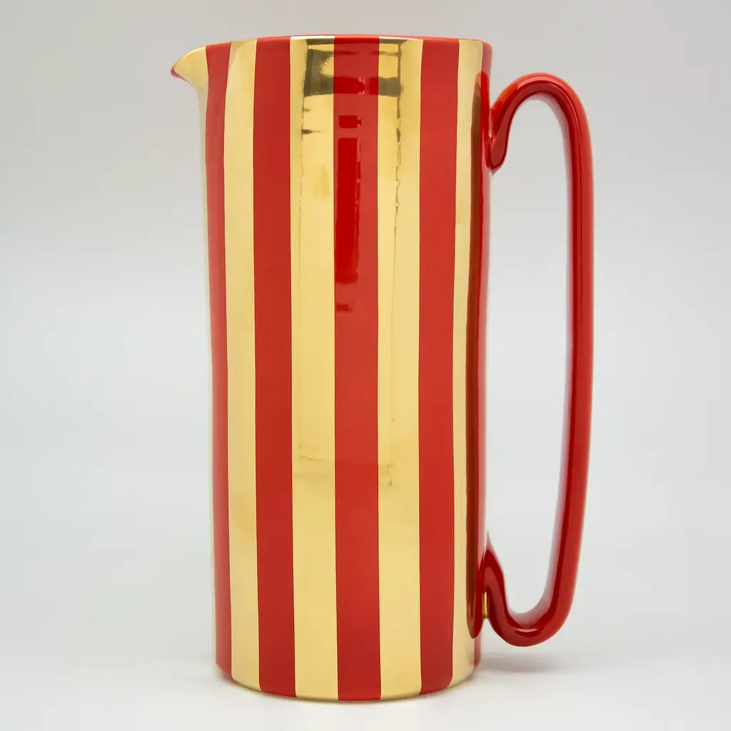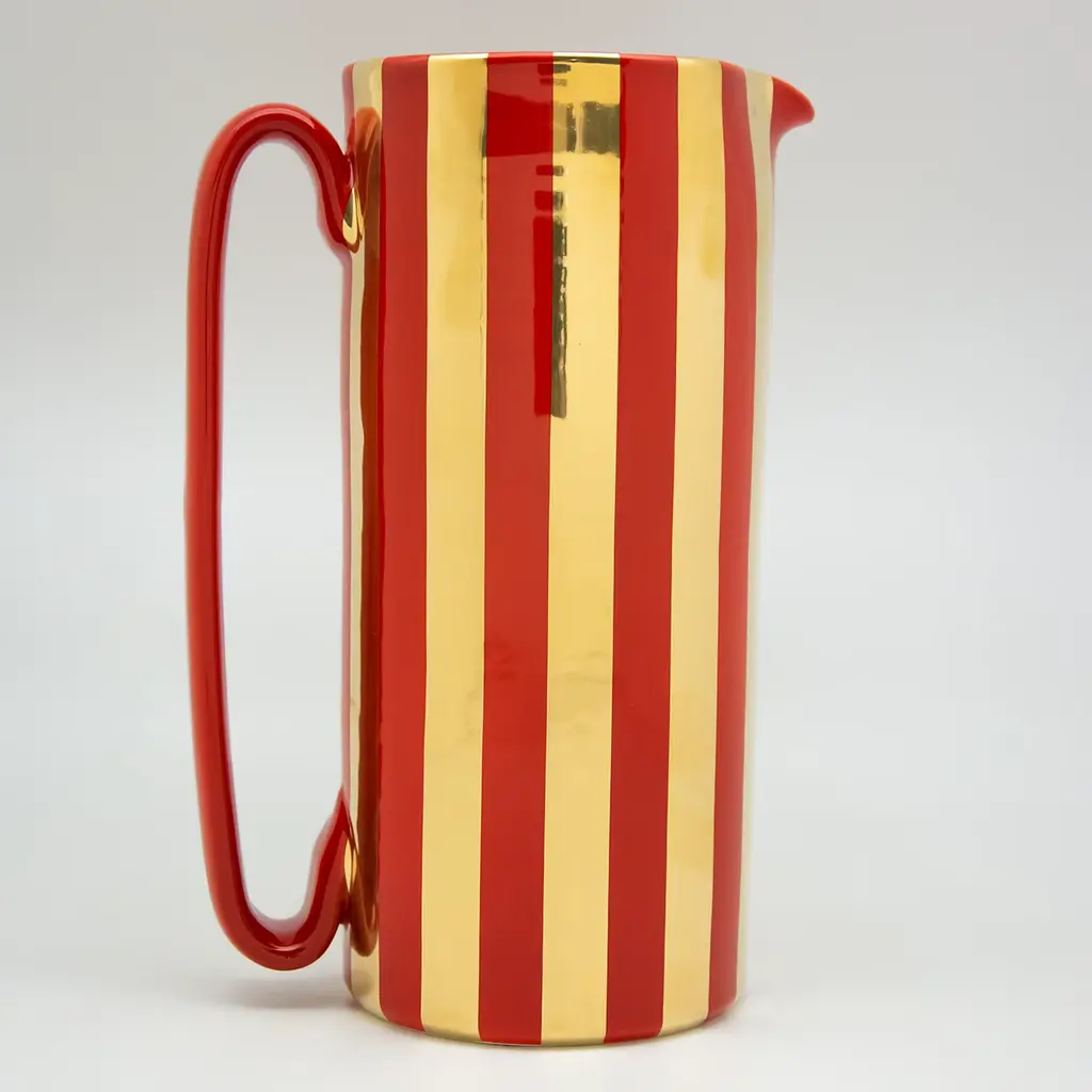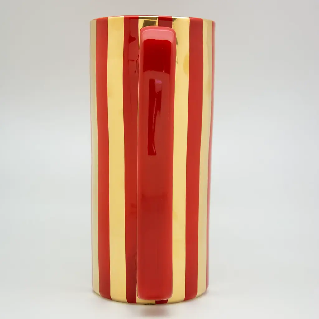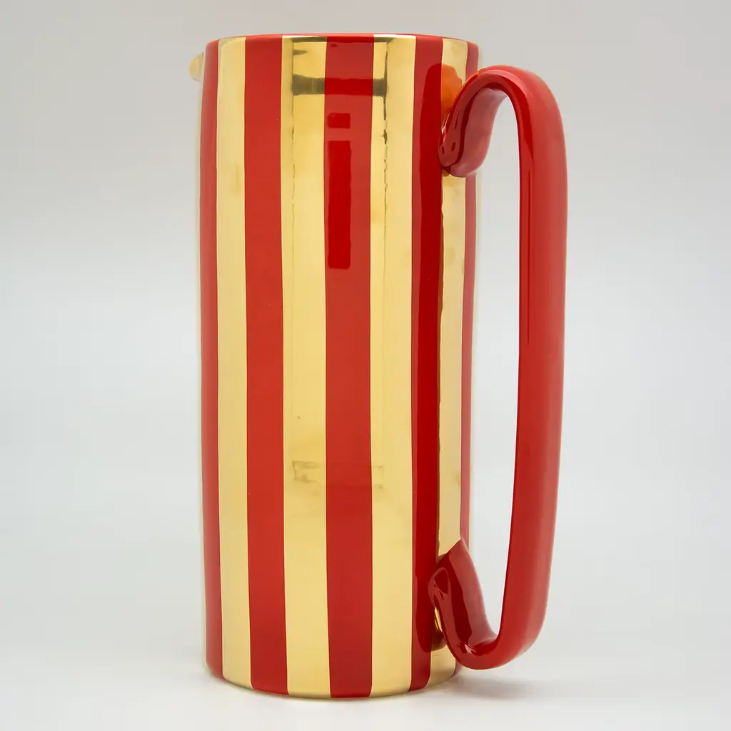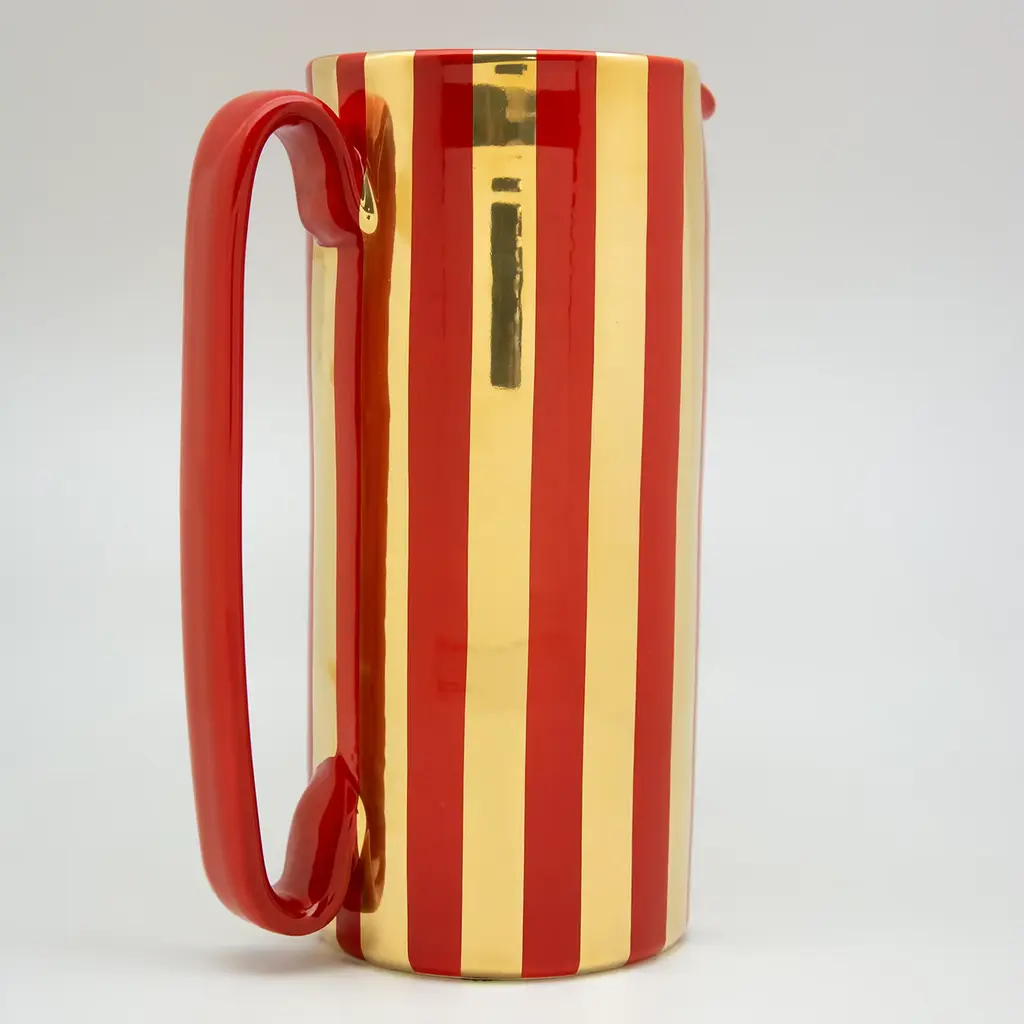 The authentic 24 K Gold 'Mercante' pitcher, is the one and only ceramic carafe with a linear handle. Handthrown in white terracotta, the stunning Serlio Carafe is a beautiful example of fine Italian craftsmanship. Enhance any table with Tuttoattacato's minimalistic design, emphasizing any classic or contemporary dinnerware with its elegant design and quality. Fired multiple times, the 24 K Gold stripes are a result of the traditional 'Terzo Fuoco' technique.