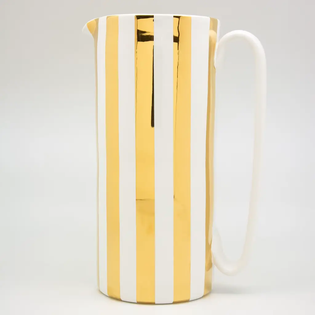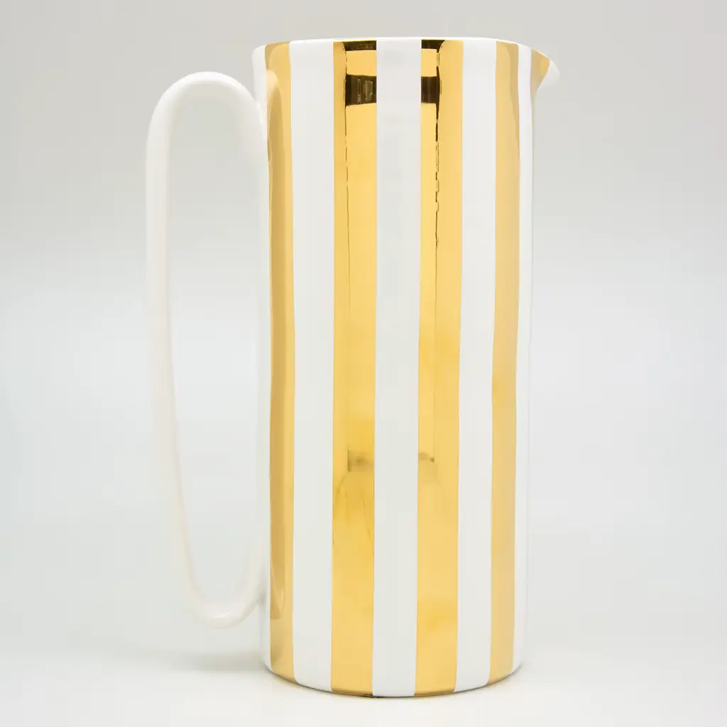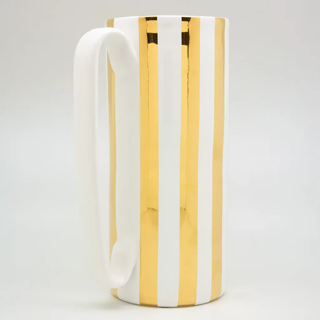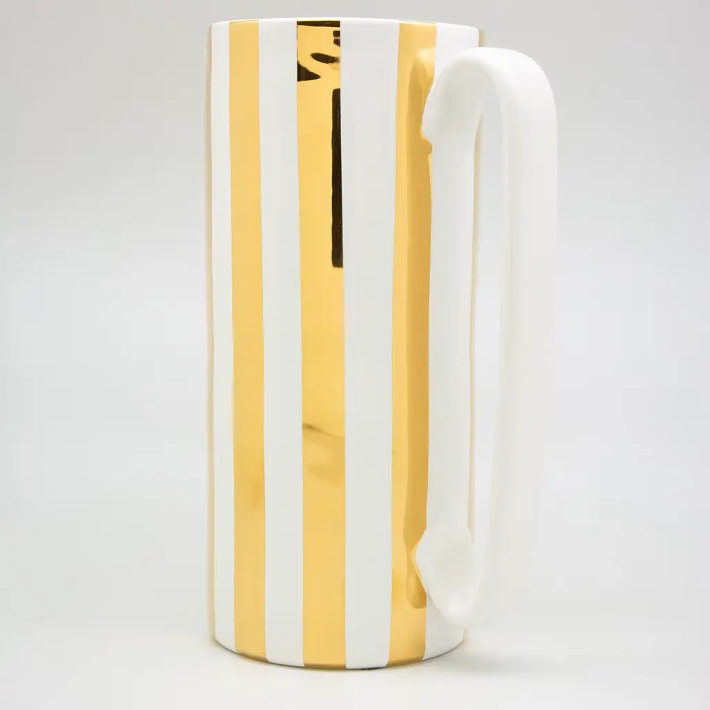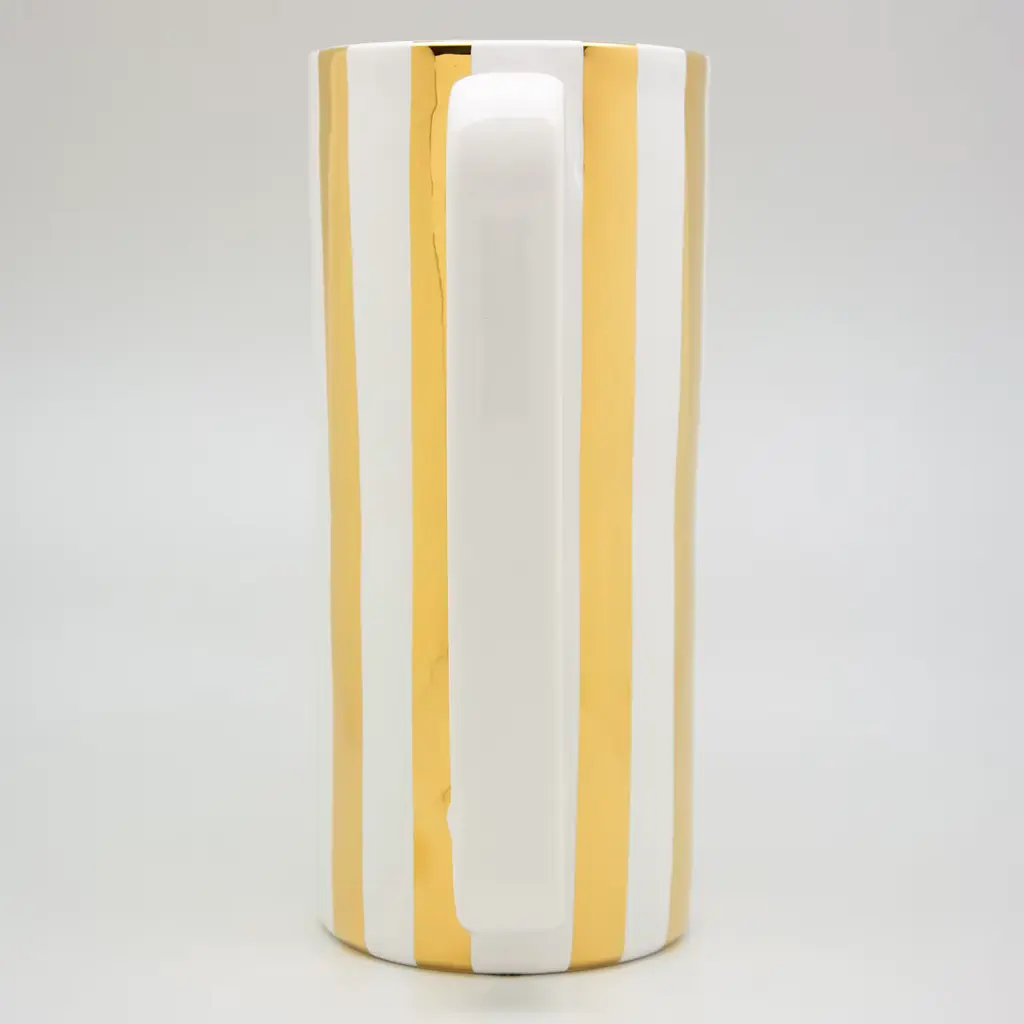 The authentic 24 K Gold 'Mercante' pitcher, is the one and only ceramic carafe with a linear handle. Handthrown in white terracotta, the stunning Serlio Carafe is a beautiful example of fine Italian craftsmanship. Enhance any table with Tuttoattacato's minimalistic design, emphasizing any classic or contemporary dinnerware with its elegant design and quality. Fired multiple times, the 24 K Gold stripes are a result of the traditional 'Terzo Fuoco' technique.