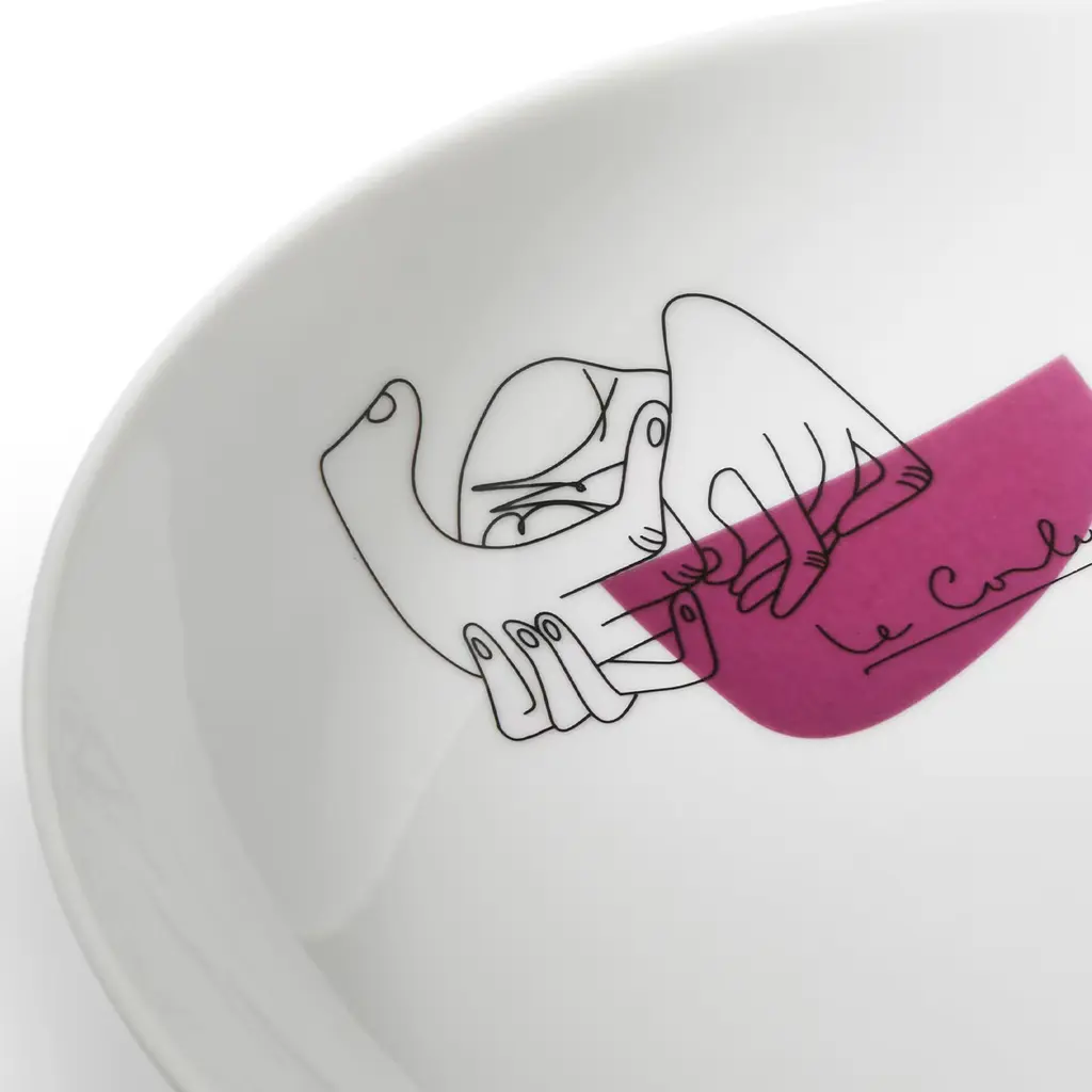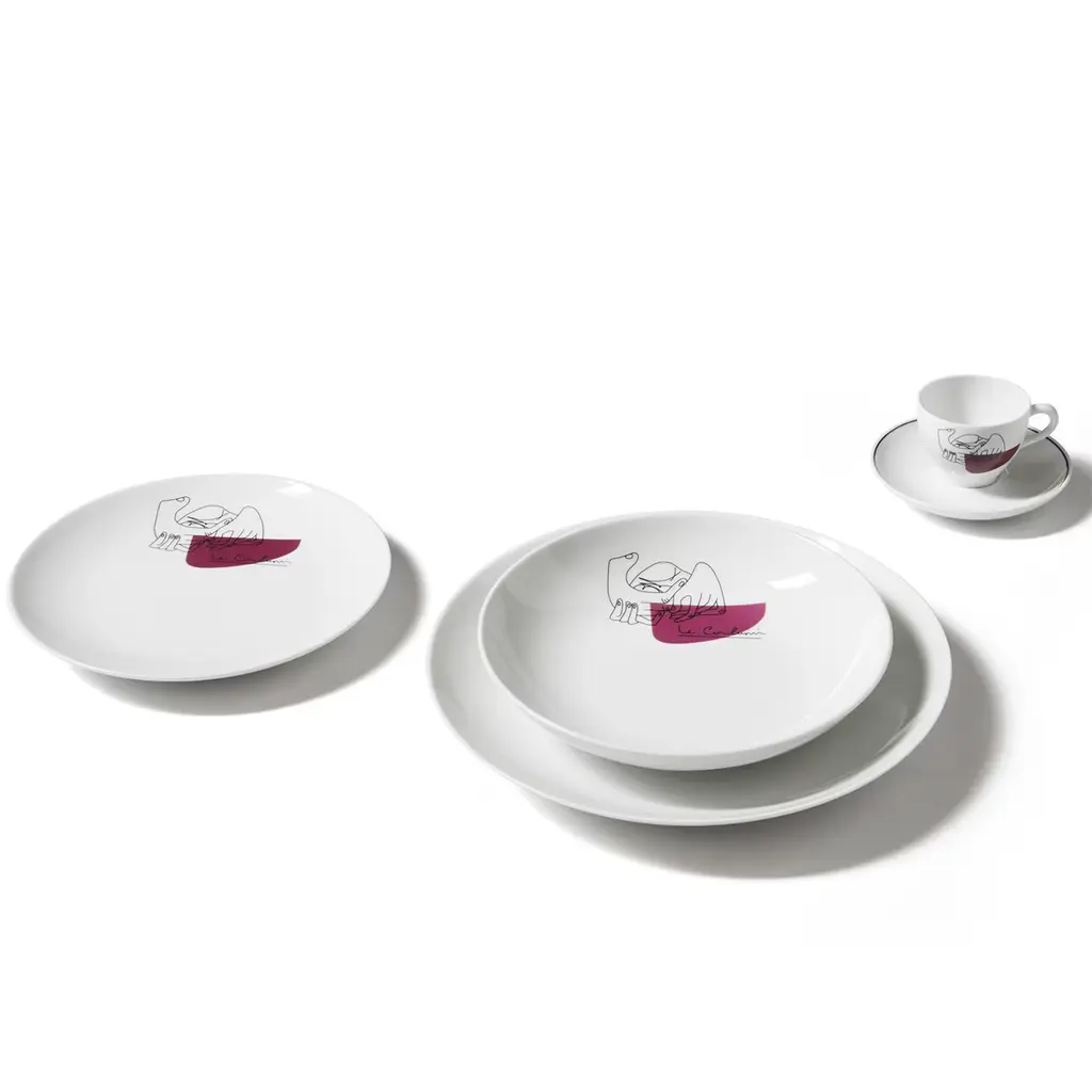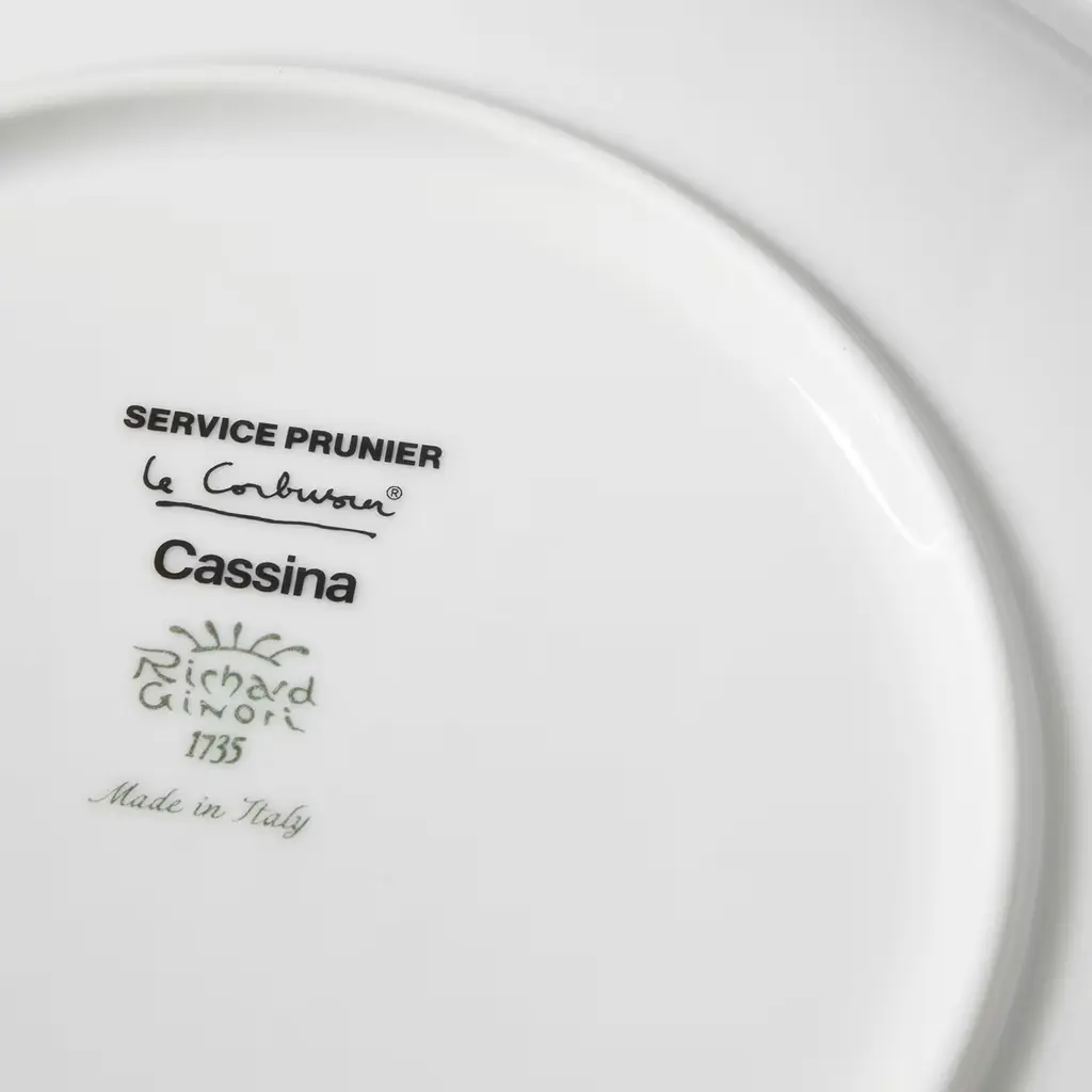 Service Prunier - Set of 2 soup plates. Cassina in collaboration with Richard Ginori and the Le Corbusier Foundation The tableware, designed by Le Corbusier, was originally created for the Prunier restaurant in London. In 1961, owner Madame Prunier asked Corbusier to design a collection of tableware for her restaurant with the interlocking hands motif found on the bottom of the Les Mains tapestry, which was designed by the Master in 1951 and displayed in a private room of the establishment. Le Corbusier used the plates himself which, as he loved to say, combined quality and taste, or “the taste of forms”. In collaboration with Richard Ginori, Cassina has reissued the tableware with full respect for the original project, paying close attention to and focusing on its authenticity. Service Prunier includes a plate, soup dish, dessert plate and coffee cup with saucer and is made of white porcelain, like the model, with Le Corbusier’s original design applied by hand.