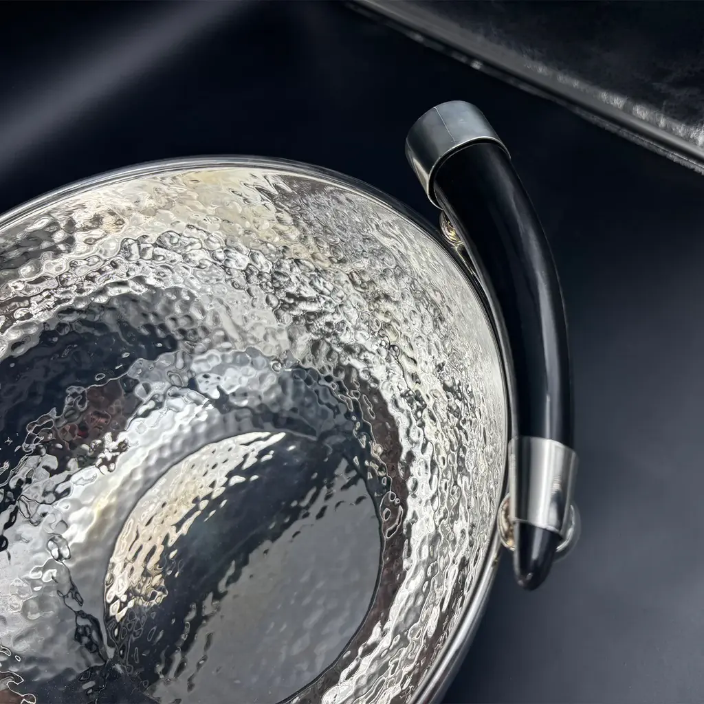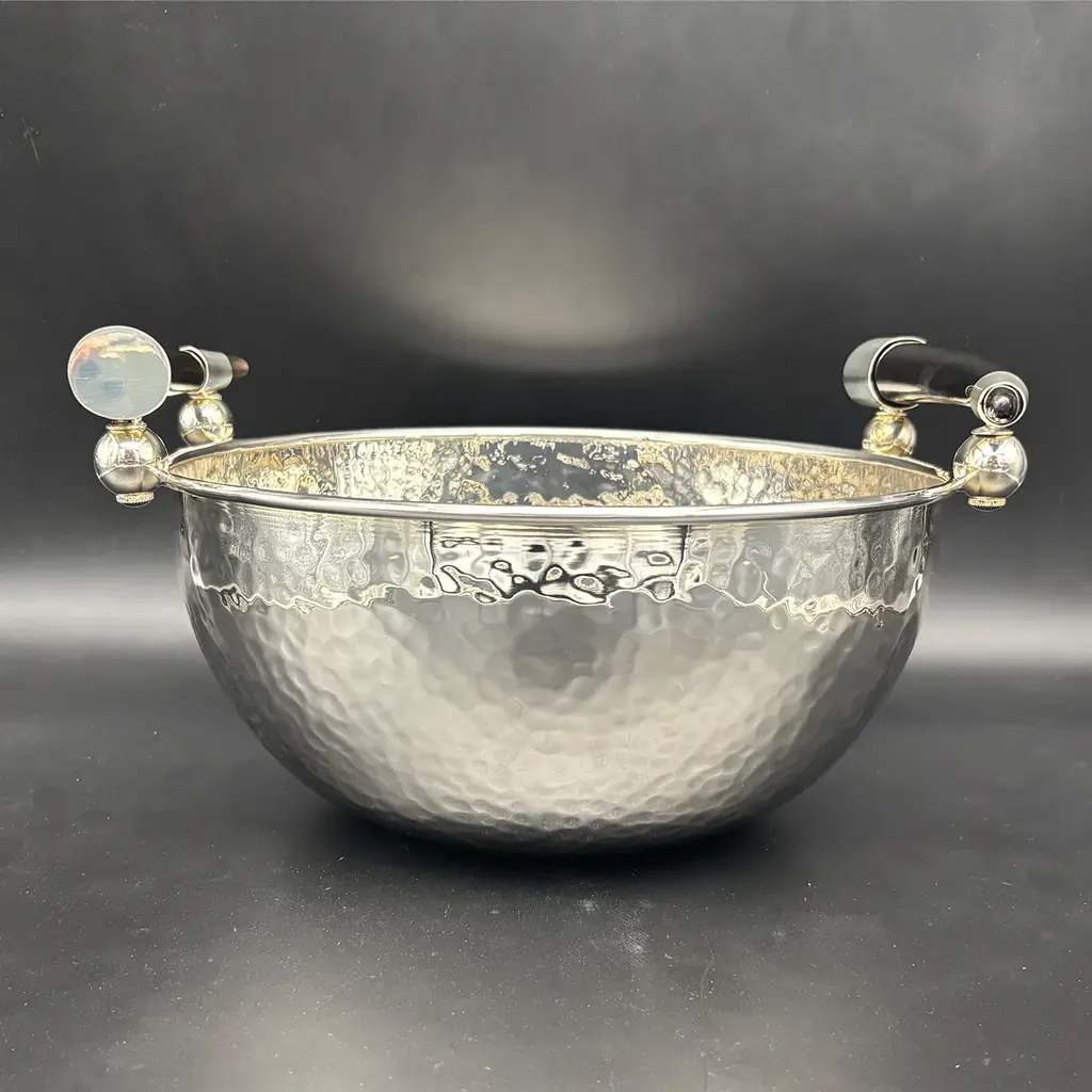 This superb bowl is a glamorous decorative accent that will look equally stunning on a dining table to hold fruit or on an entryway console with a bouquet enlivening both modern and classic decors with its timeless design. Part of the Horn Collection, the generous round silhouette boasts a shimmering hand-hammered finish and two honey-veined brown horns placed on the rim as decorative handles. This sleek yet sophisticated bowl can be displayed with other pieces from the same collection for a cohesive look that will not go unnoticed.