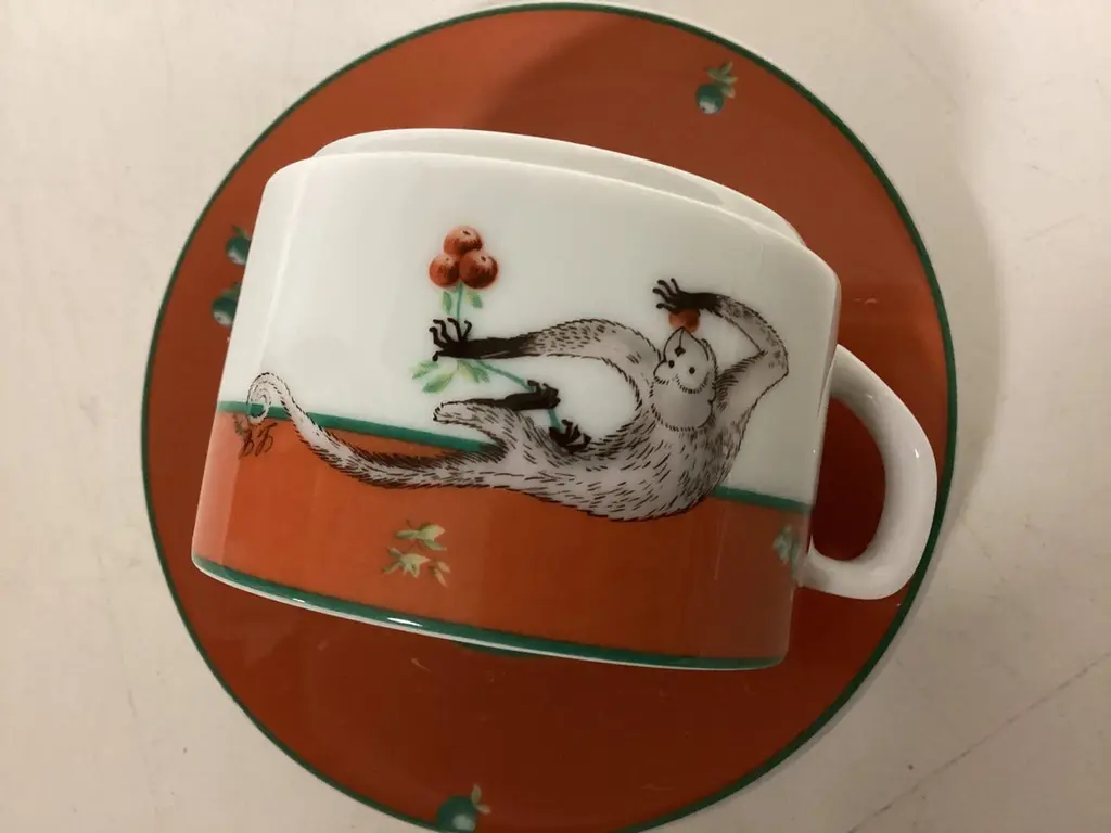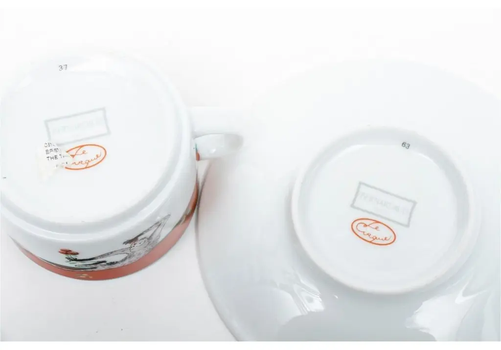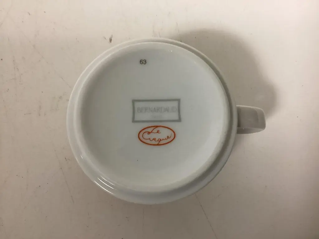 From pasta primavera to world-renowned decadent desserts, Le Cirque's ubiquitous reputation for presenting its fine dining fare with whimsy and fun, landed it on the map of must-dine destinations in New York for glitterati and foodies alike. No matter the location, monkeys and circus themes remained a design staple of the iconic restaurant. Although the landmark restaurant's NYC doors are now closed, Black Rock Galleries is pleased to offer items from the famed restaurant. Bernardaud custom porcelain tea cup with saucer having monkeys picking fruit for Le Cirque Restaurants.Dimensions:Cup - 3 1/4" W x 2 1/8" HSaucer - 5 3/4" Condition: Very good. Never used, with original box.Used at the following locations:Le Cirque 2000 (1995 onward)Las Vegas.
