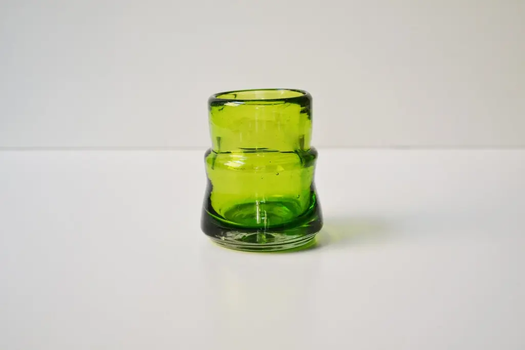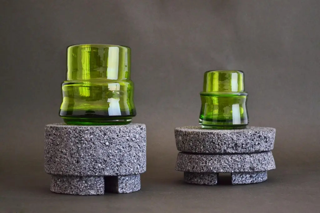 Acatl is a collection of Tumblers and liquor, Mezcal and Tequila glasses in 6 different colours. Produced in an artesanal way in Jalisco, Mexico using 100% recycled glass. The shape of this collection of glasses is manifested from the union of two elements. A cylindrical center and a ring that forms an X shape that in turn refers to the way the ancient Mexicas tied their flowers or canes, the symbol for this "ACATL" or reed. The Acatl symbol shape was used in several sculptures of the pre conquist times and in several cultures around what is today Mexico. This form has also been used in architecture, the anahuacalli museum for example, if the central part of the building is observed on the facade, it makes this movement in the shape of an X that the reeds produce when tied to the center with force and this form gives stability to the tie to stay in vertical way.These glasses are made of 100% recycled glass, mainly coca cola bottles, curiously Mexico is among the countries with the highest consumption of this soft drink in the world.