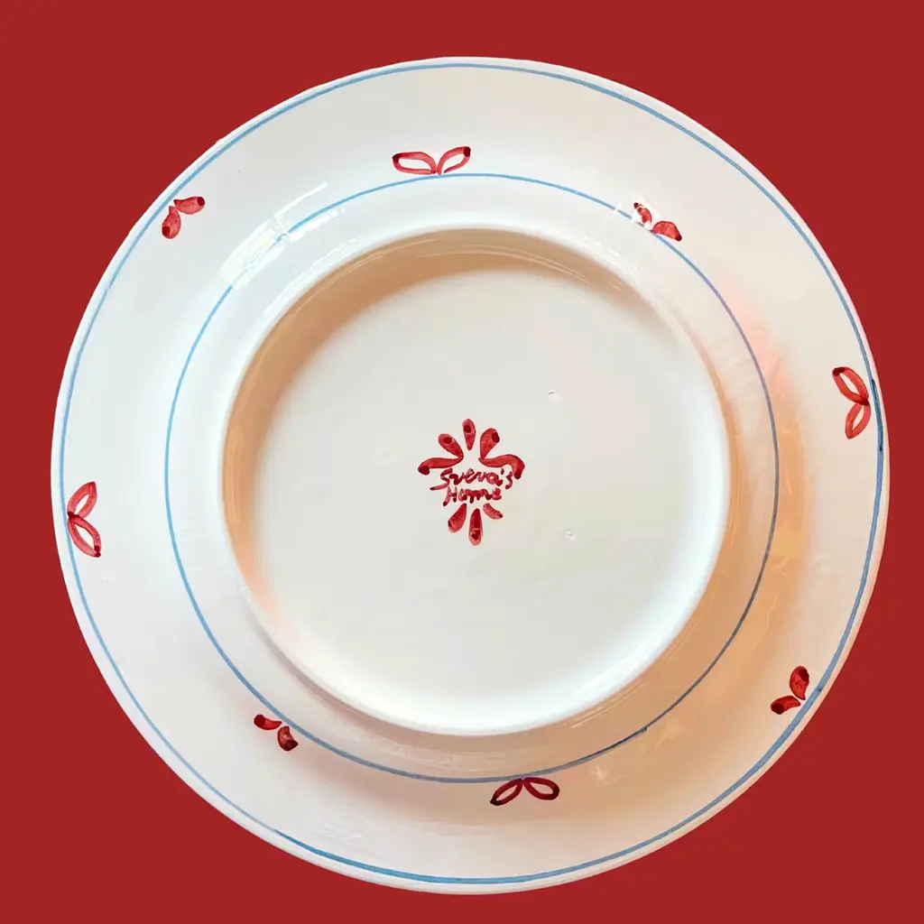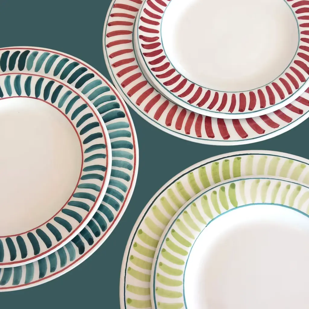 Hand-painted by local artisans in Italy, these exquisite and distinct Italian ceramic dining plates are an ideal match for 'I Dine in Colour' tableware collection. Infuse any table with vibrancy and joy using the limited-edition tableware designed by Sveva's Home. Each set includes a minimum of: 6 large dining plates and 6 small dessert plates. For personalized plates with various colors and initials, there is an additional cost.