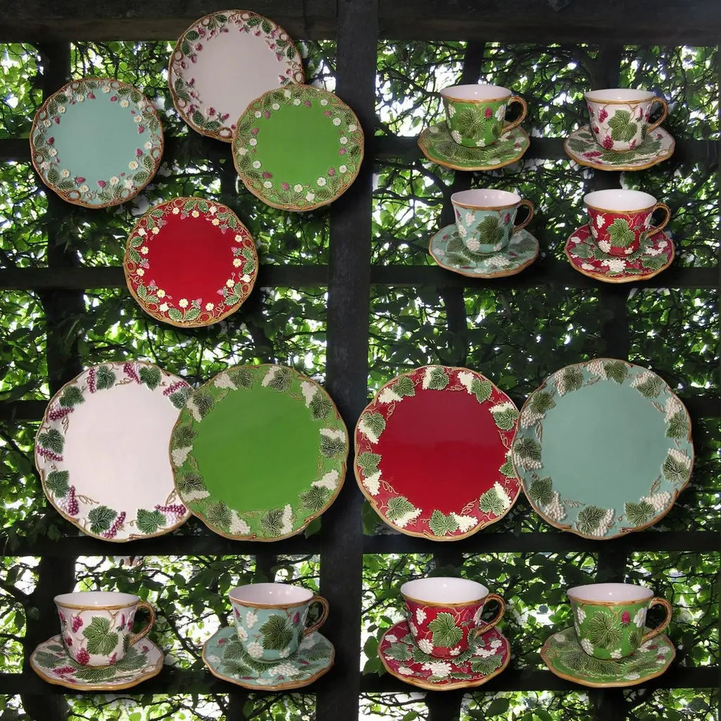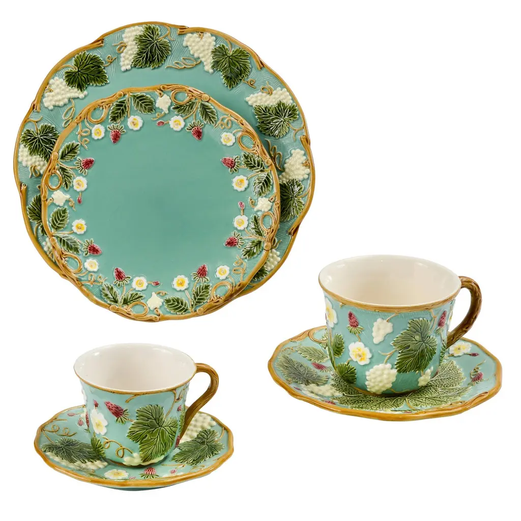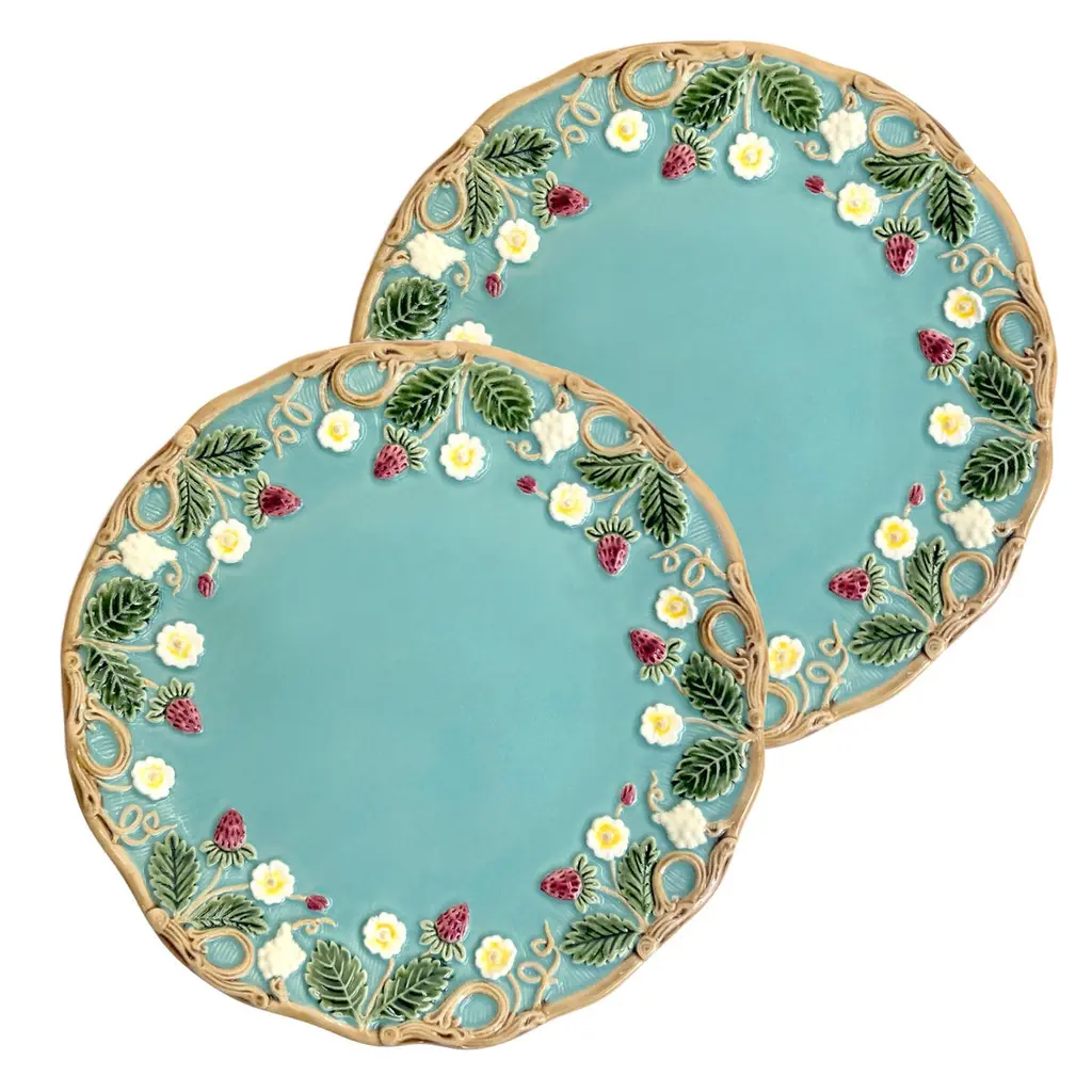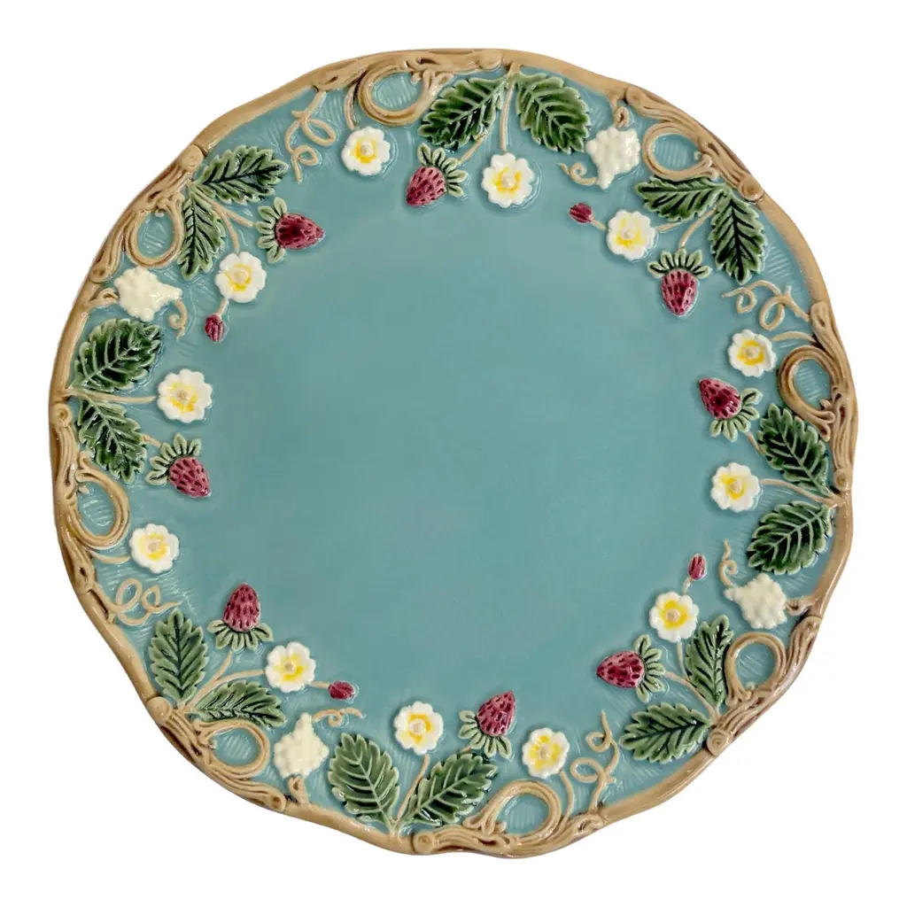 Set of Two blue dessert plates from the George Sand Collection.This dessert plate is adorned with a raised pattern of strawberries, strawberry leaves, and small white flowers, carefully arranged around its edge. Its bright, blue center creates a harmonious contrast with the natural elements surrounding it. The wavy rim, resembling a wooden branch, adds an artisanal touch. Perfect for showcasing your desserts, this plate’s rustic yet elegant design fits beautifully into festive and sophisticated settings.This unique set of two earthenware dessert plates is part of the George Sand collection, named after the iconic set created by the French manufactory Creil & Montereau for the renowned author George Sand. Inspired by the romantic countryside she cherished, the collection originally featured strawberries and ribbons. With their poetic aesthetic, these plates pay homage to her love for nature. The delicate barbotine grapevine decorations in relief add a refined and artistic element, echoing the spirit of the romantic French author who lived in Nohant-Vic.While these plates are microwave-safe, they are recommended for hand washing only.Available in several colors, the plates can be mixed and matched for a personalized table setting, with other pieces from the same collection sold separately.