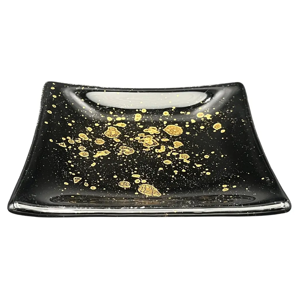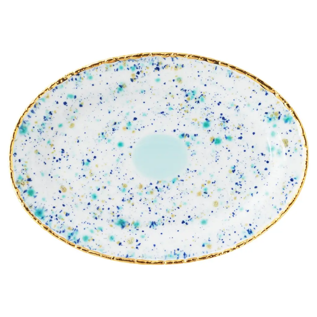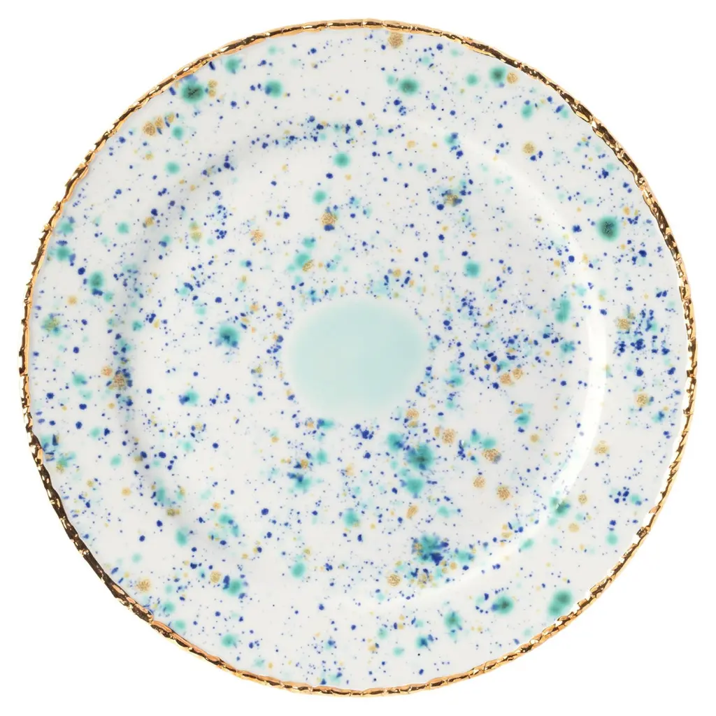 First exhibited at the Milan Design Week 2018, artistic fancy and luxe materials combine in this striking set of two dessert plates handcrafted from white porcelain. A pastel-turquoise cloud stands at the item's center, bringing focus and calm to its otherwise vibrant decoration of speckles rendered in dappled green, blue, yellow, and black by artist Coralla Maiuri. 24K gold leaf covers the craquelure rim for increased luxury. Not microwave safe.