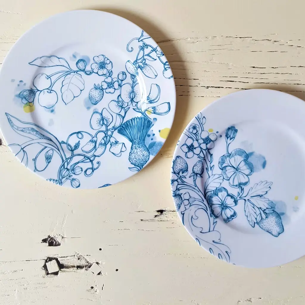 The "Blue Summer Collection" is a contemporary reinterpretation of the traditional white and blue Delft porcelains. Its motifs are an elegant balance of wild fruits and flowers into a fresh exquisite ornamental design. The smooth tones of blue with some highlight touches of yellow gave a contemporary twist to all the designs. Each design varies slightly due to the manual techniques used in their manufacturing. Oven and dishwasher are safe.