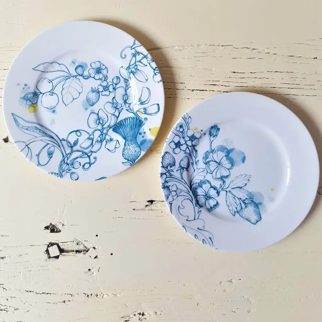 The "Blue Summer Collection" is a contemporary reinterpretation of the traditional white and blue Delft porcelains. Its motifs are an elegant balance of wild fruits and flowers into a fresh exquisite ornamental design. The smooth tones of blue with some highlight touches of yellow gave a contemporary twist to all the designs. Each design varies slightly due to the manual techniques used in their manufacturing. Oven and dishwasher are safe.