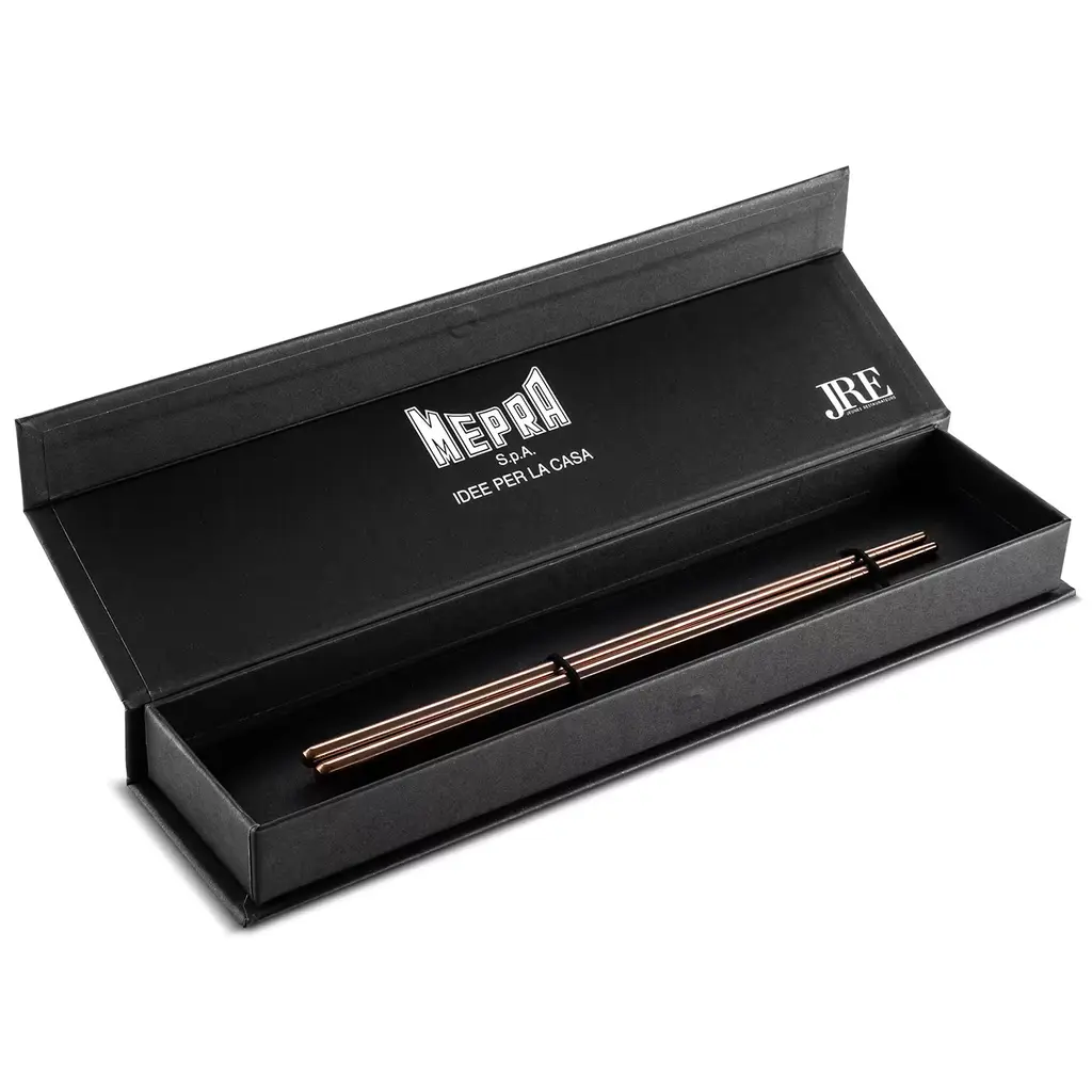 This set of 2 of stainless steel chopsticks add versatility to any flatware set turning every Asian-inspired meal into a special occasion. Slender and delicate, yet sturdy enough for everyday use, this modern design boasts a brushed bronze finish with PVD titanium-based coating applied with a high-tech process originally developed by NASA. Dishwasher safe, resistant to stains and oxidation, these chopsticks are available in other finish, with silver plating, and can be engraved with a personalized logo upon request to the Concierge.