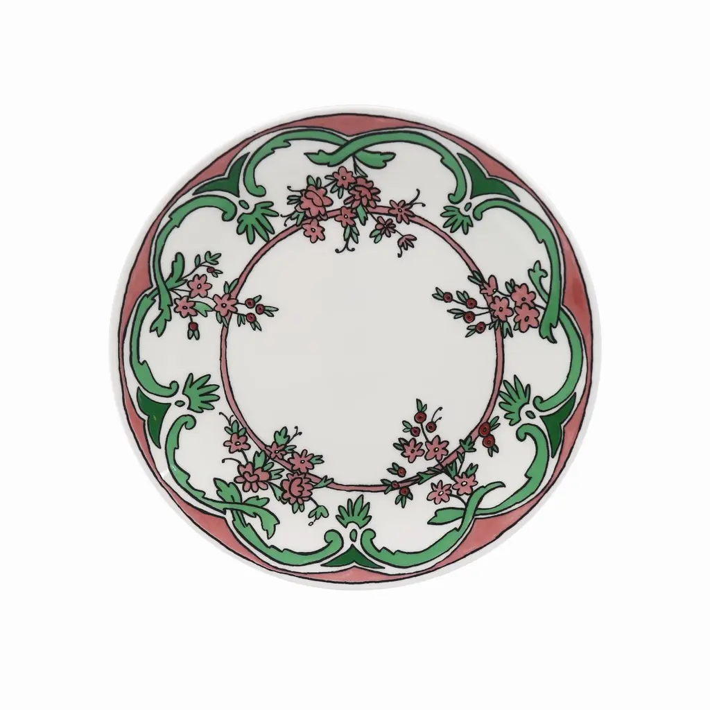 A bold expression of contemporary tableware, this dessert plates set is defined by its sinuous design and smooth color application. Made of white porcelain, these plates' floral pattern is hand drawn with black lines and subsequently colored in with a vibrant green hue. The subtle imperfections in hue and design are hallmarks of a uniquely hand-made process. The plate measures 19 cm.
