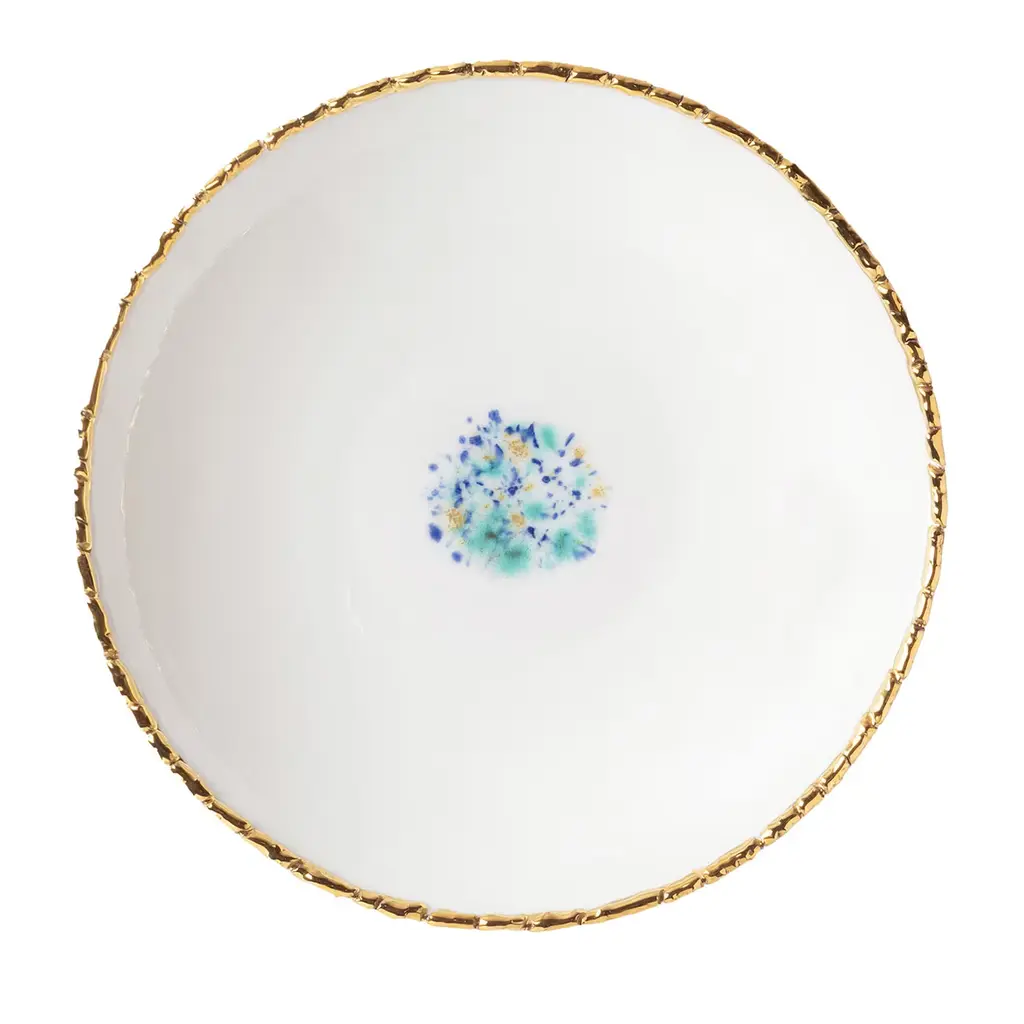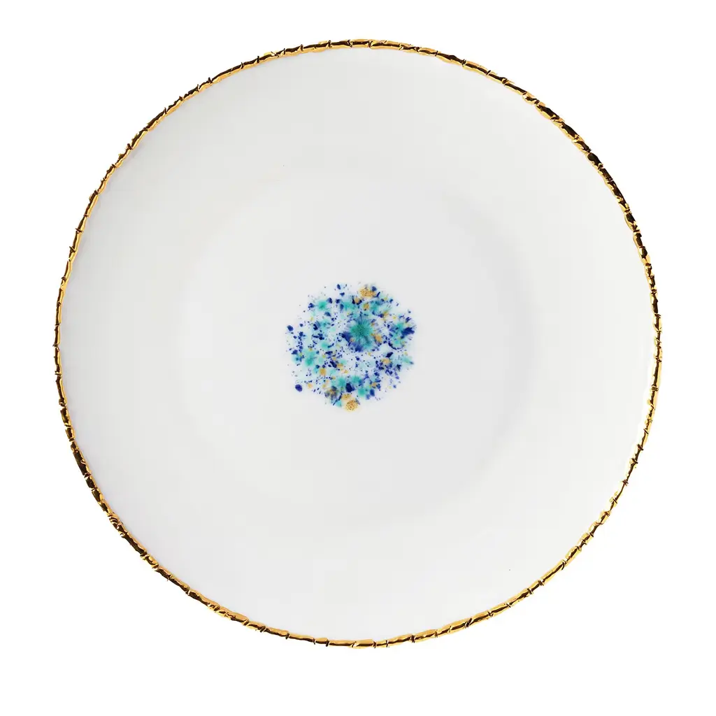 Luxurious and cheerful, the Florida collection was launched in 2023. It is inspired by the American state famous for its strong character and colorful heritage. Each line is characterized by a color. They are inspired by some of the most famous places in Florida, recalling its beaches and its sunsets, stretching between the Gulf of Mexico and the Atlantic Ocean.Palm Beach pink, Miami orange, Amelia green, Naples yellow, Crystal tourqoise, Islamorada lavender.Each plate is decorated with a lightly colored center interspersed with multicolor dots. The rim is richly decorated golden leafs. The charger, tea and coffee cups have are decorated with a golden net- The dessert plates and teapots have a distinct design characterized by golden rays crisscrossing their surface.