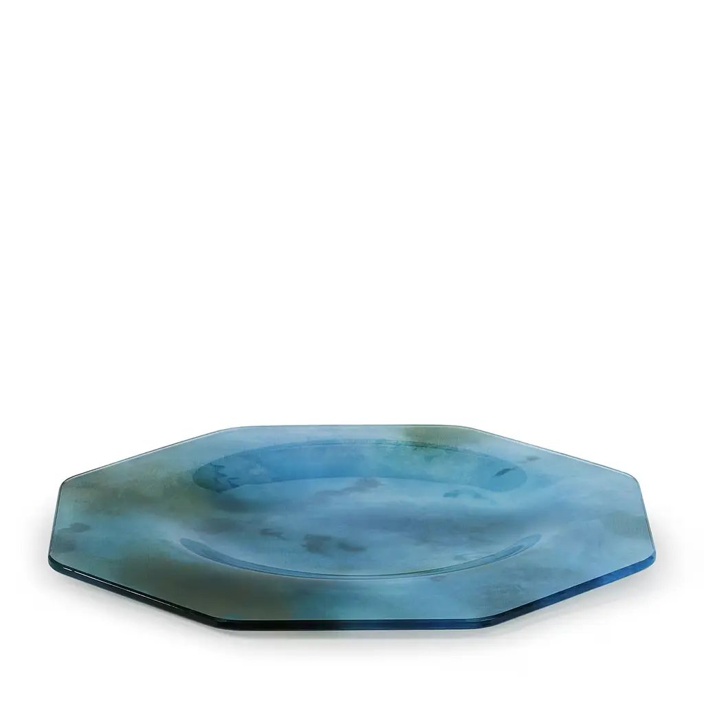 The perfect plate shape to be held with one hand while standing up and having a chat. The other hand holds a glass, a fork, and finger food. The octagonal shape is asymmetrical with a larger brim for a secure grip. The hollow base is off-center for perfect balance. The crystal-clear material used, methacrylate, is fused together with printed polyester organza, thermo-formed, and finished by hand. Food-certified, impact resistant, dishwasher safe, stackable, handy, and of great impact.