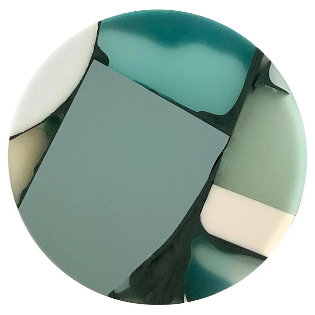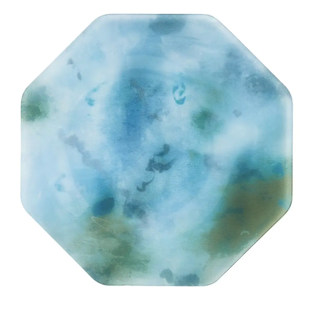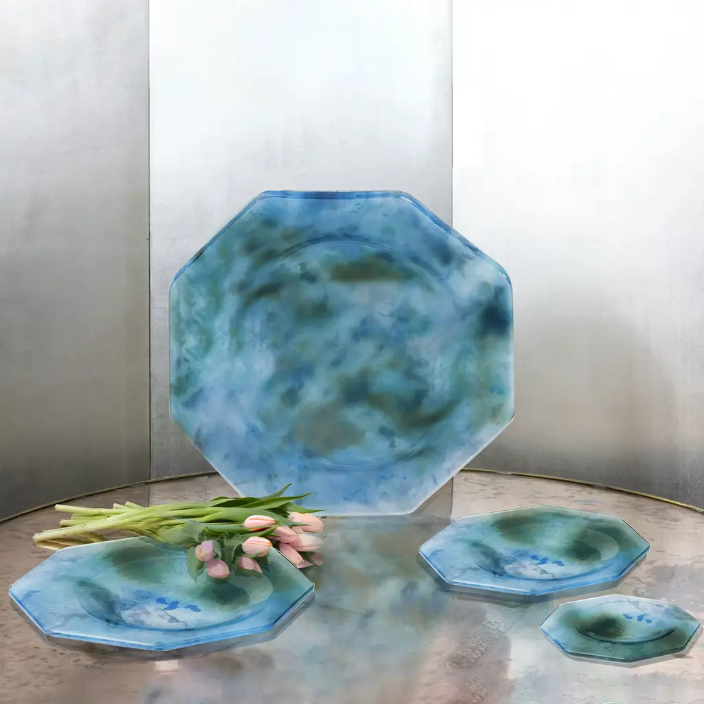 The perfect plate shape to be held with one hand while standing up and having a chat. The other hand holds a glass, a fork, and finger food. The octagonal shape is asymmetrical with a larger brim for a secure grip. The hollow base is off-center for perfect balance. The crystal-clear material used, methacrylate, is fused together with printed polyester organza, thermo-formed, and finished by hand. Food-certified, impact resistant, dishwasher safe, stackable, handy, and of great impact.