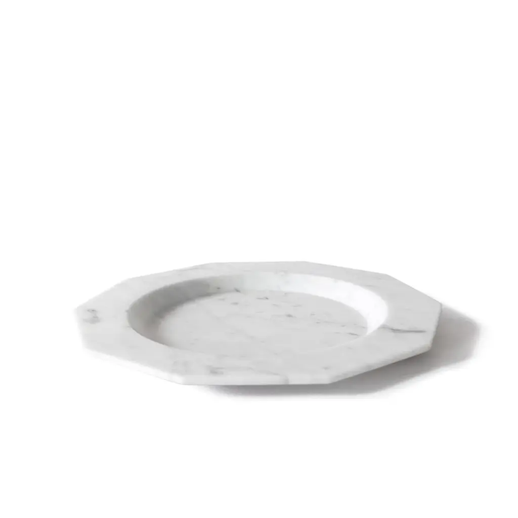 Dinner Plate in white Carrara marble. Each piece is in a way unique (every marble block is different in veins and shades) and handmade by Italian artisans specialized over generations in processing marble. Slight variations in shape, color, and size are to be considered a guarantee of a handmade creation. It's important not to use lemon or vinegar on it, clean only with water and natural soap (like Marseilles soap), do not put it in the dishwasher.