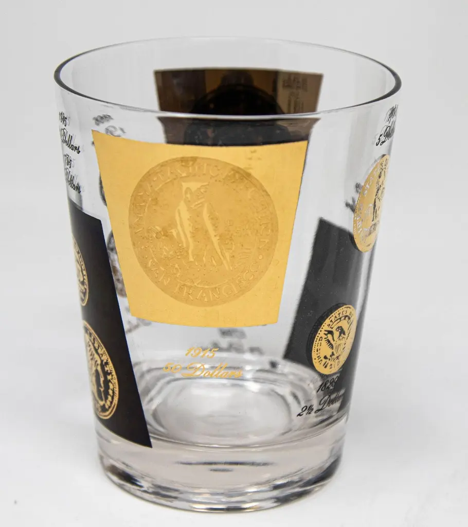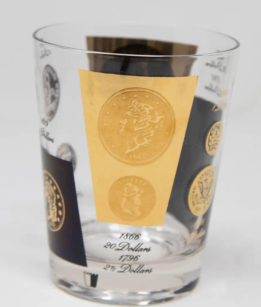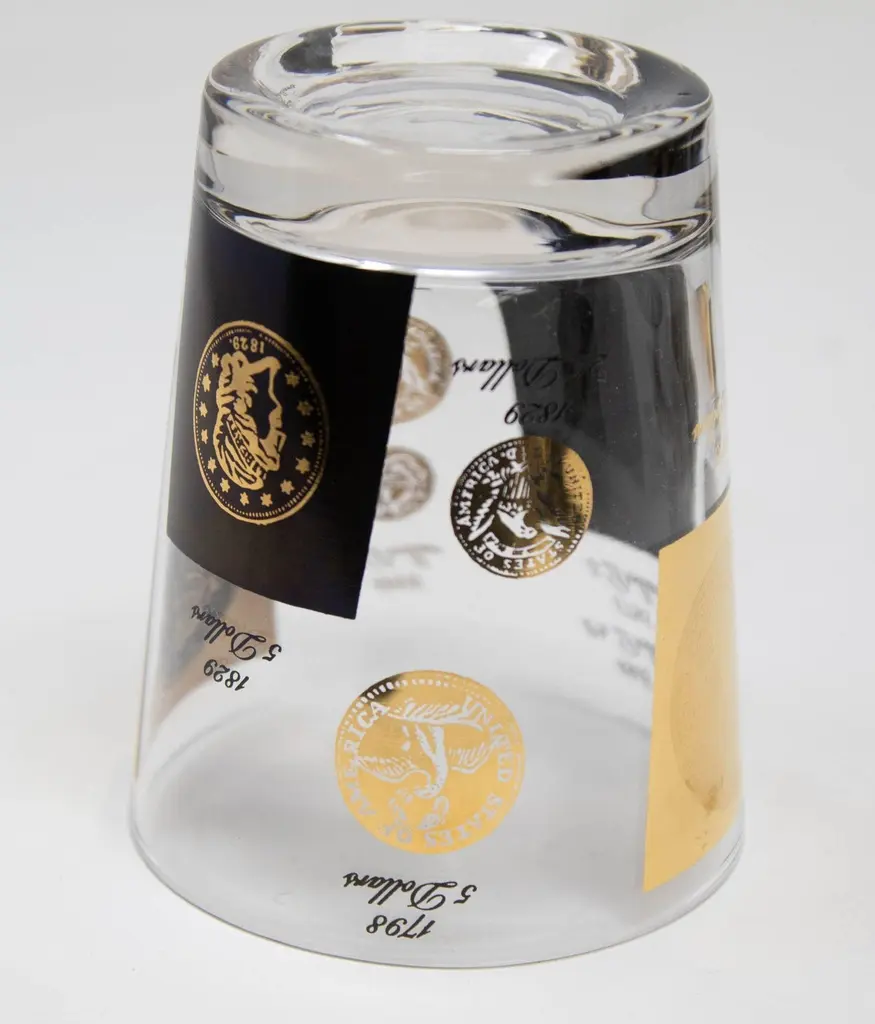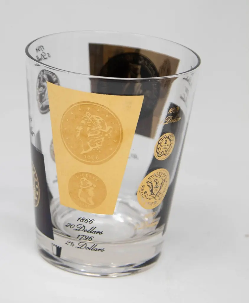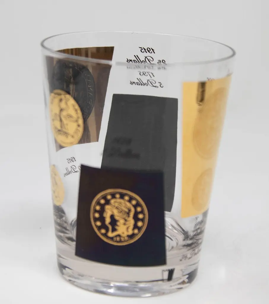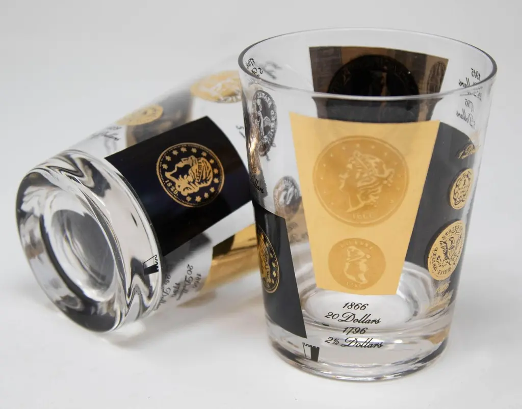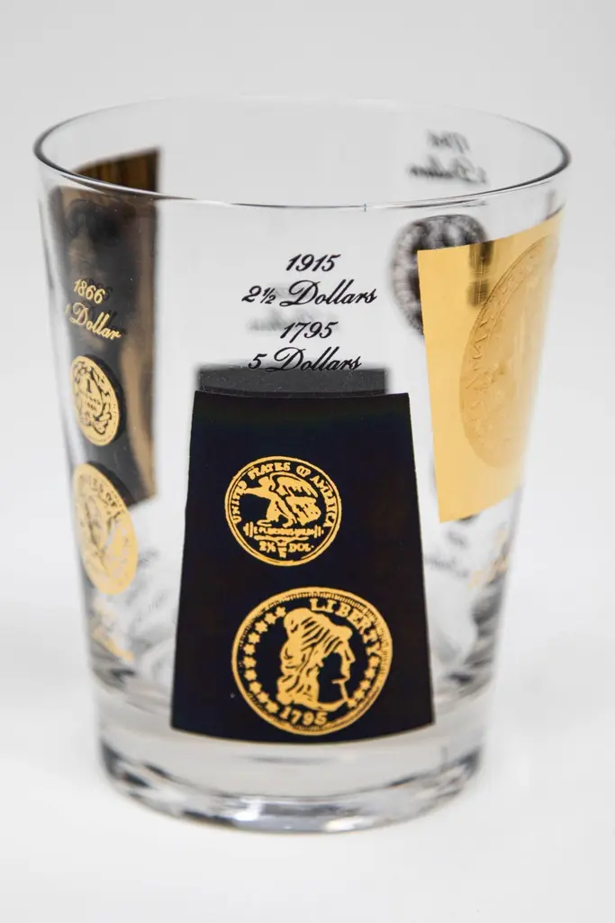 Set of 2 gold and black coin barware double old fashioned glasses by Cera Glass.Mid-century 1960s Cera 22-karat gold and black glassware barware.Mid-century modern vintage set of 2 pieces double old fashioned glasses gold printed presidential coins.The glasses feature "US Coins" in black and 22-karat gold.Mid-Century Modern barware glasses by Cera.Mid-century vintage set of 2 pieces rocks glasses 1960s gold printed.Excellent addition to any bar or bar cart. Set of 2.Dimensions: Height: 4.5 in Diameter: 3.5 in.Discontinued collection. Multiple set available.These collectible barware are so mad men!!How wonderful it will look in your Mid-Century Modern bar.