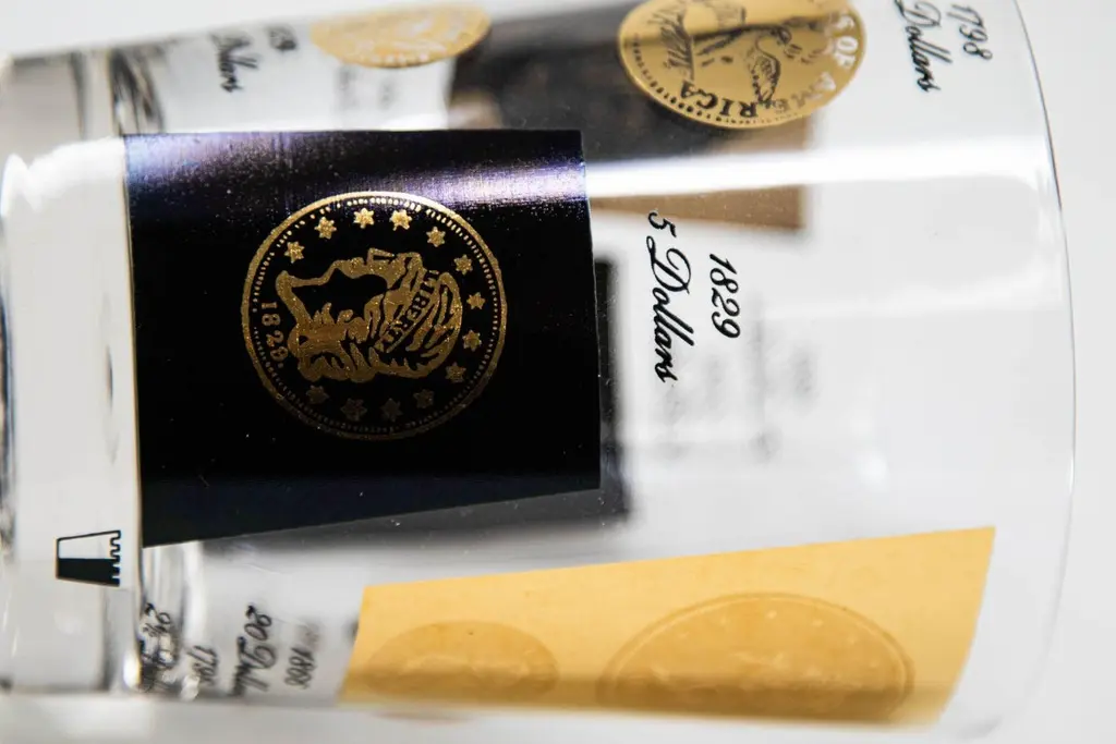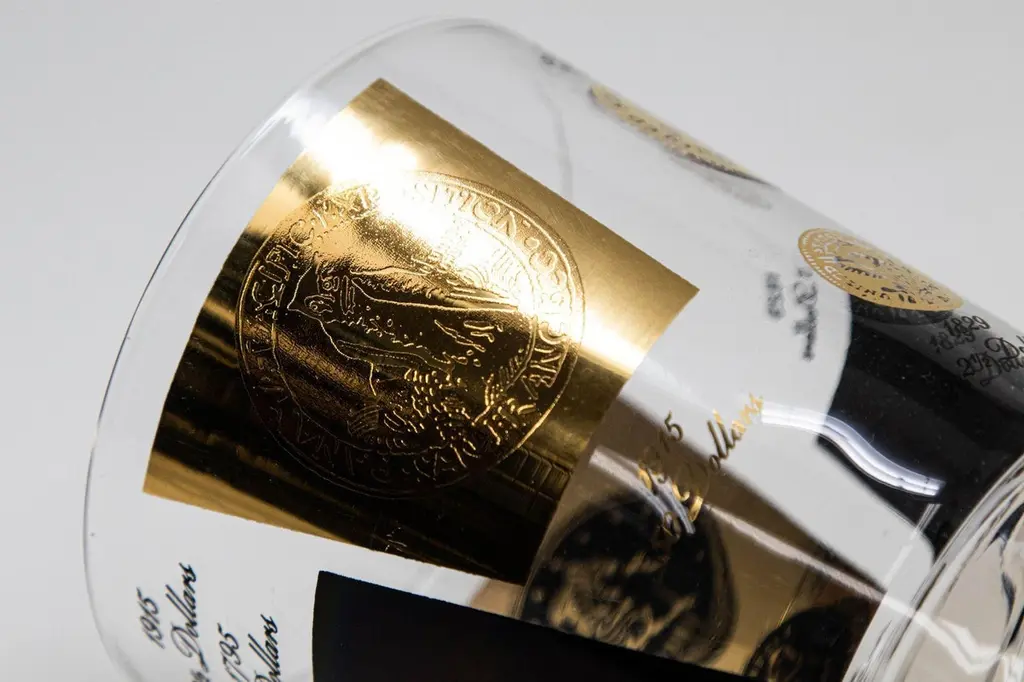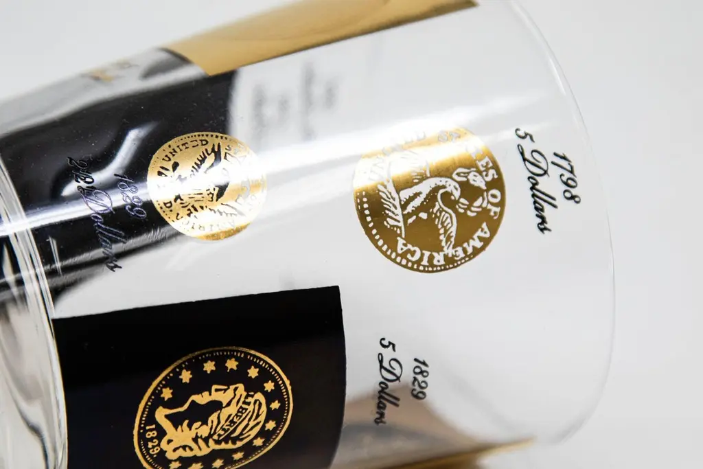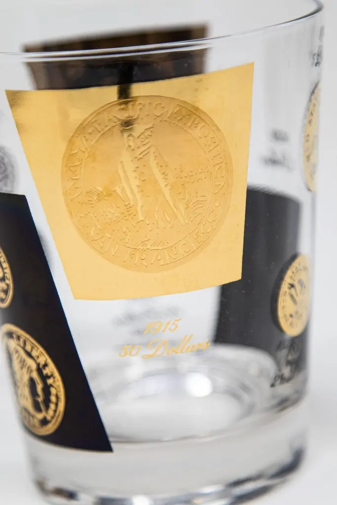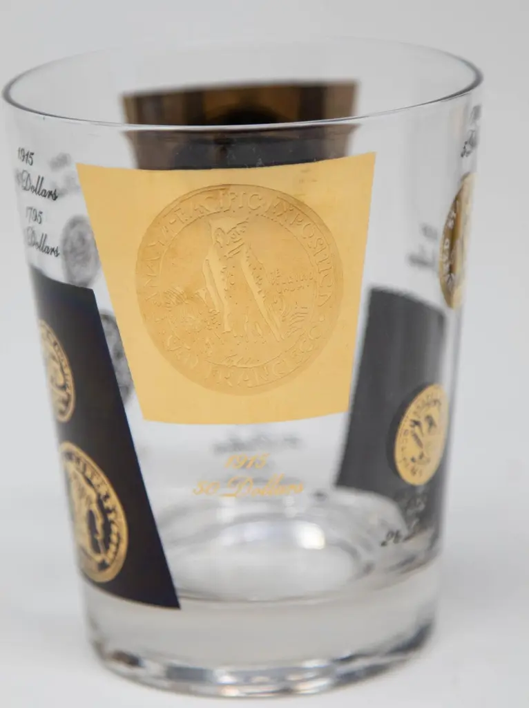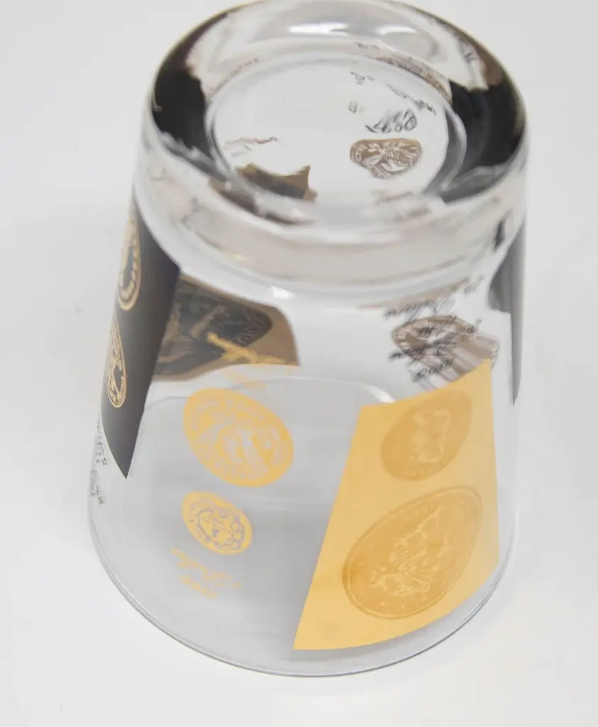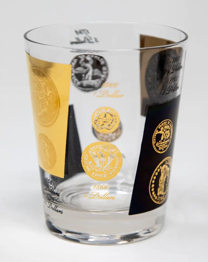 Set of 2 gold and black coin barware double old fashioned glasses by Cera Glass.Mid-century 1960s Cera 22-karat gold and black glassware barware.Mid-century modern vintage set of 2 pieces double old fashioned glasses gold printed presidential coins.The glasses feature "US Coins" in black and 22-karat gold.Mid-Century Modern barware glasses by Cera.Mid-century vintage set of 2 pieces rocks glasses 1960s gold printed.Excellent addition to any bar or bar cart. Set of 2.Dimensions: Height: 4.5 in Diameter: 3.5 in.Discontinued collection. Multiple set available.These collectible barware are so mad men!!How wonderful it will look in your Mid-Century Modern bar.