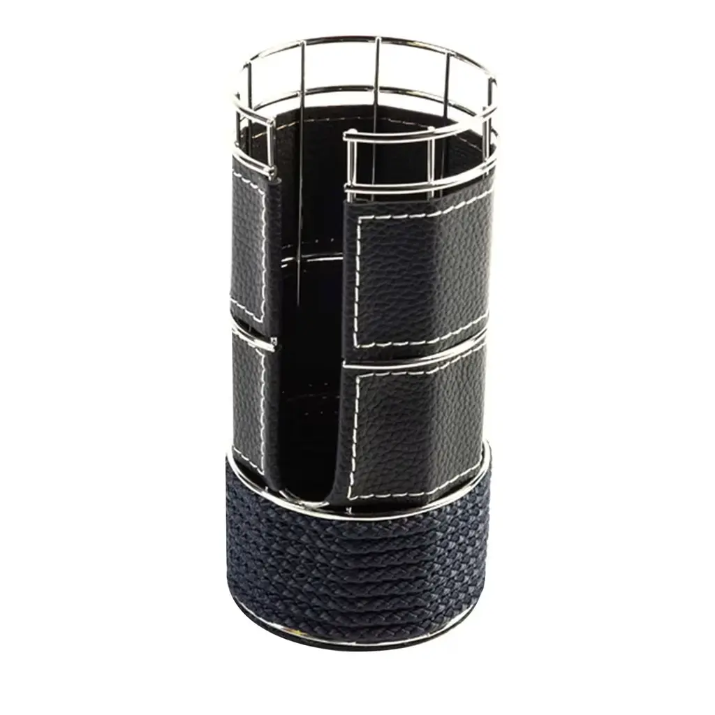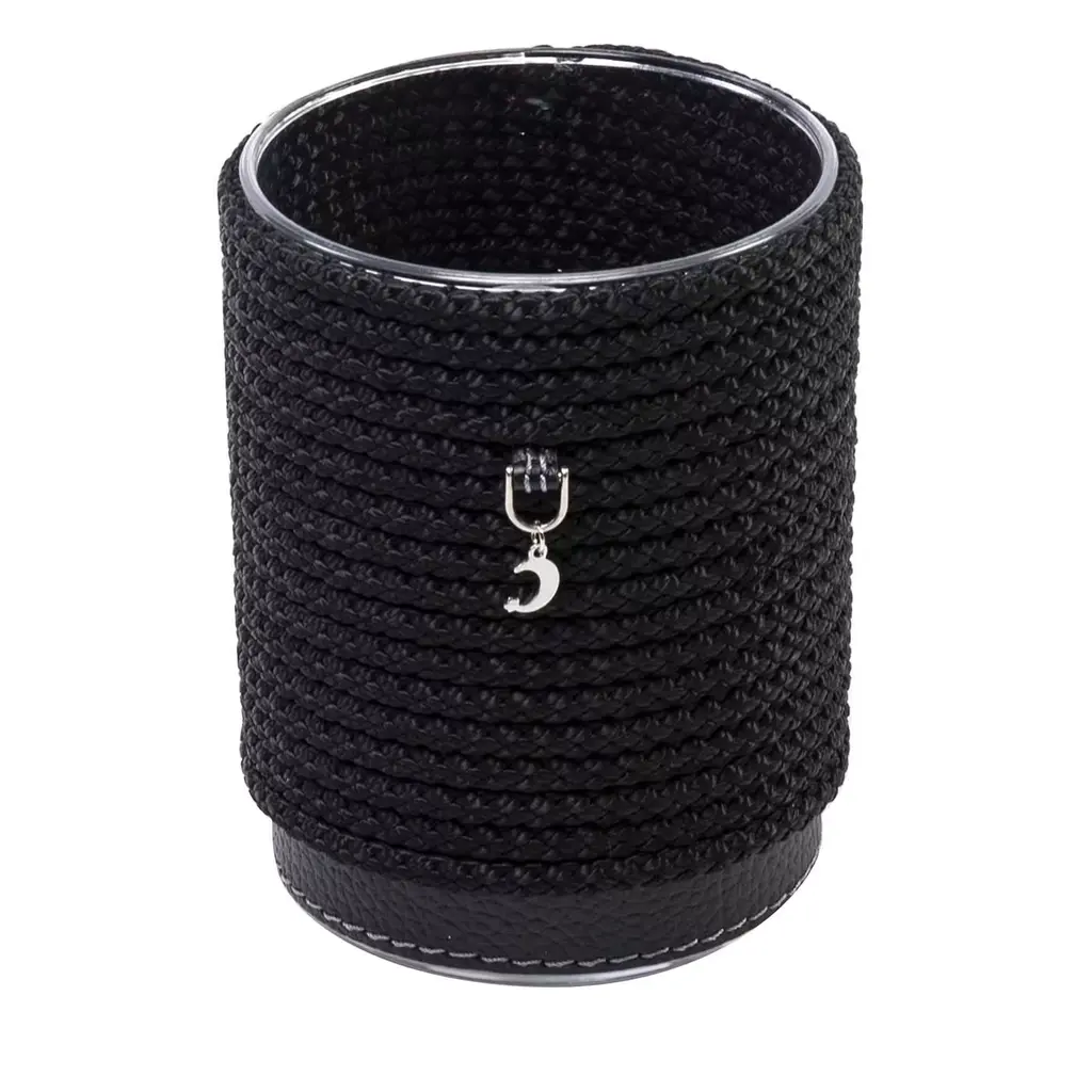 Enriched with elegant details, this paper cup holder will make a statement on any table during both formal and casual gatherings. Unique and functional, its cylindrical body has a grid-shaped structure made of metal with a chromed finish with a vertical opening for ease of use and functionality. The base is enriched with rope in a silver gray color, like the faux-leather that covers the sides of the piece.