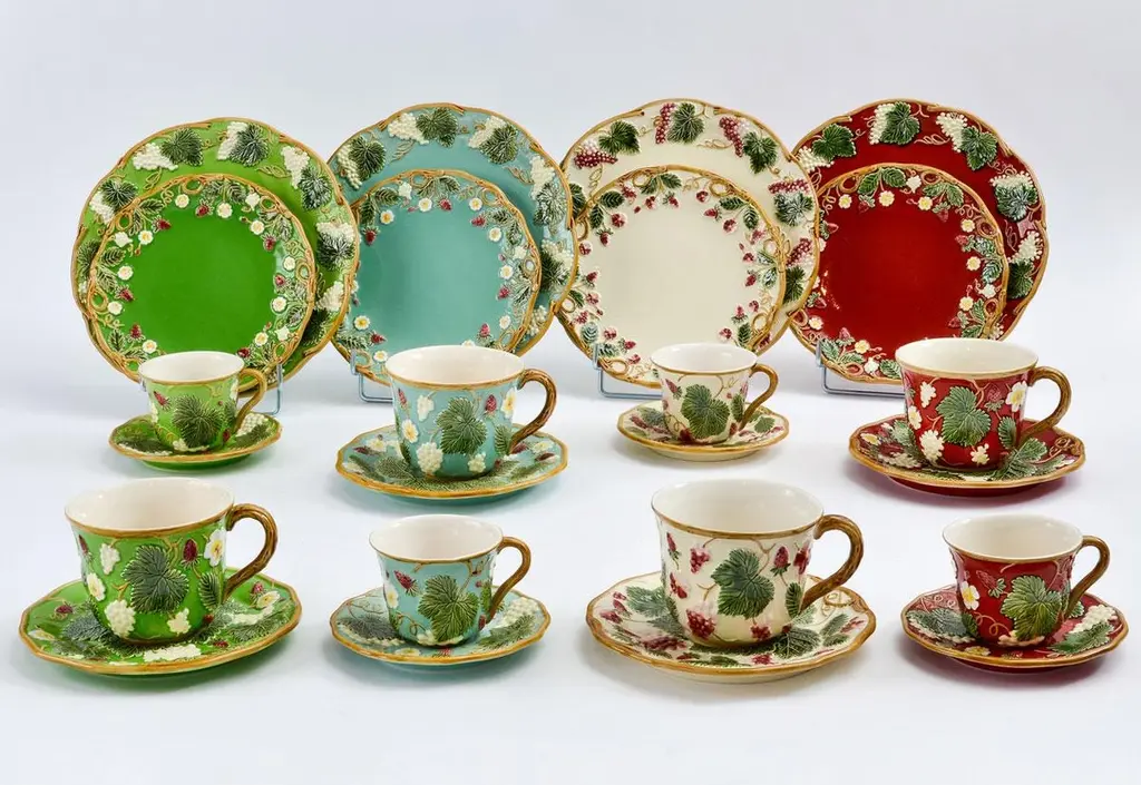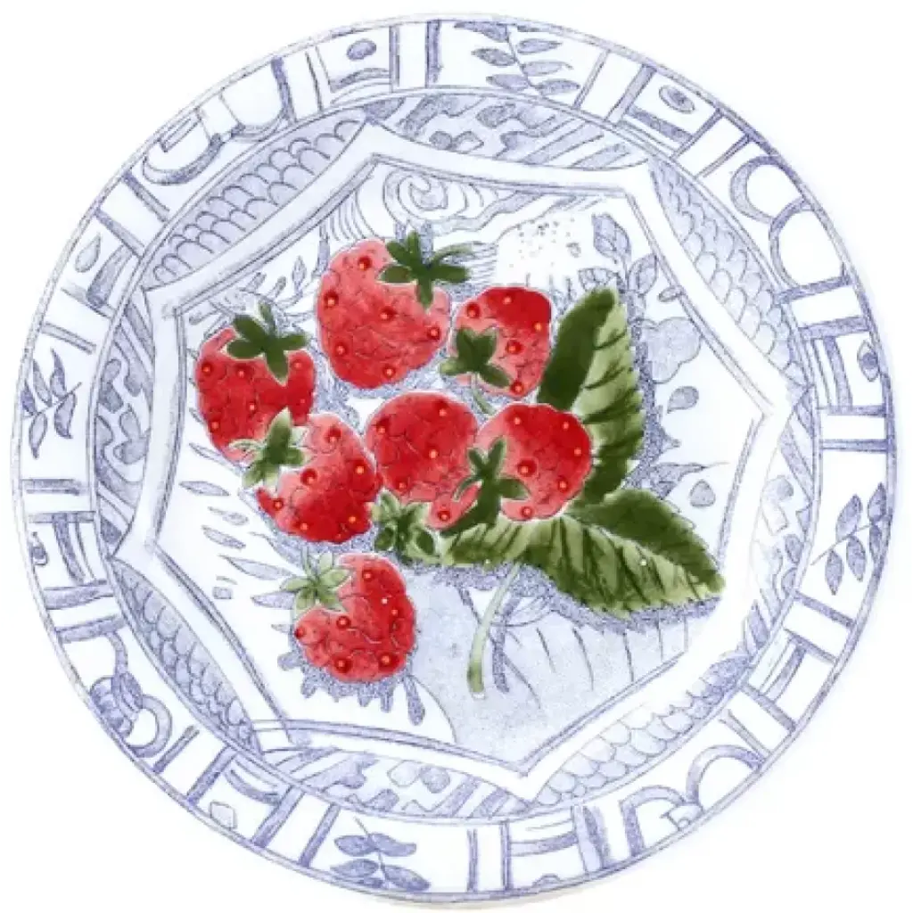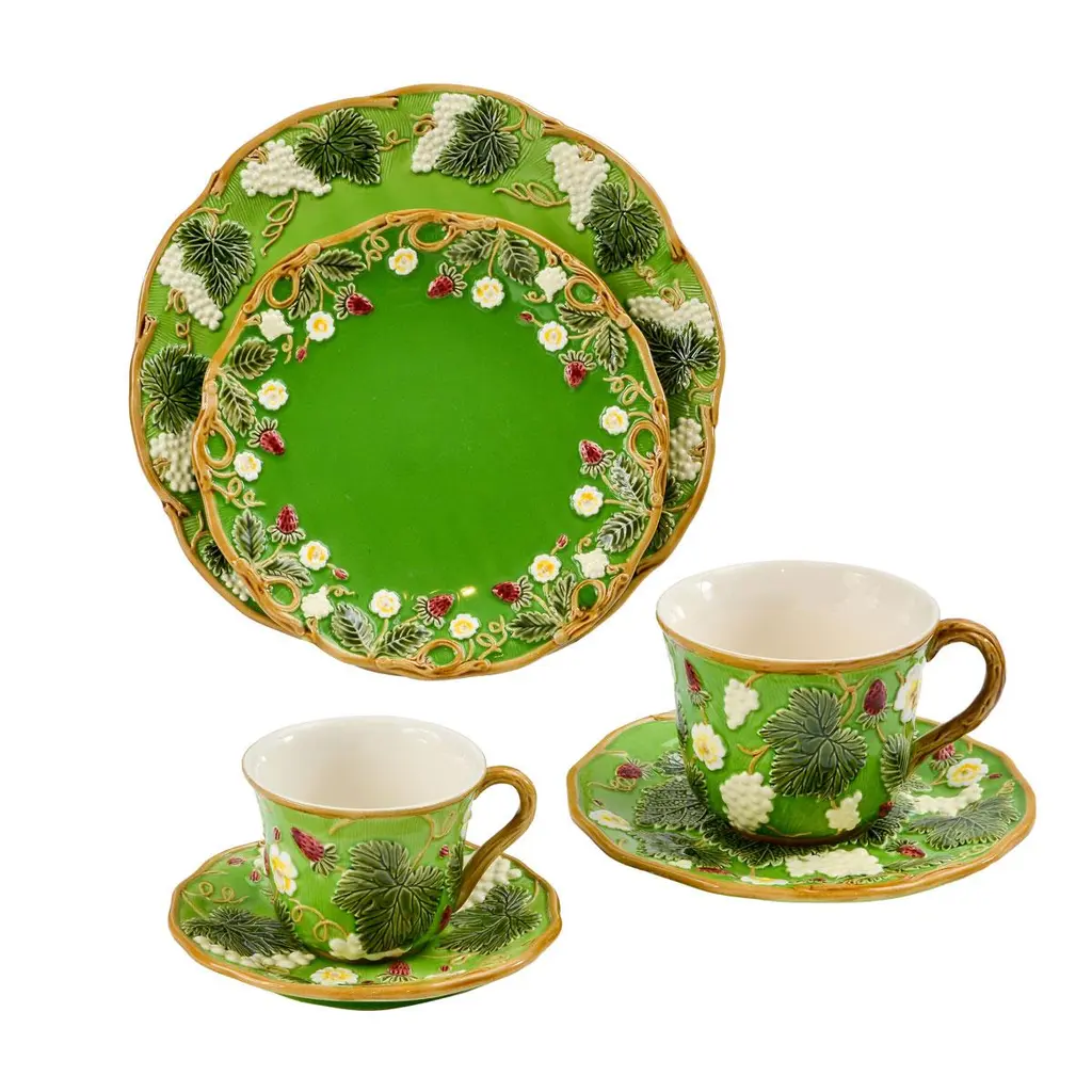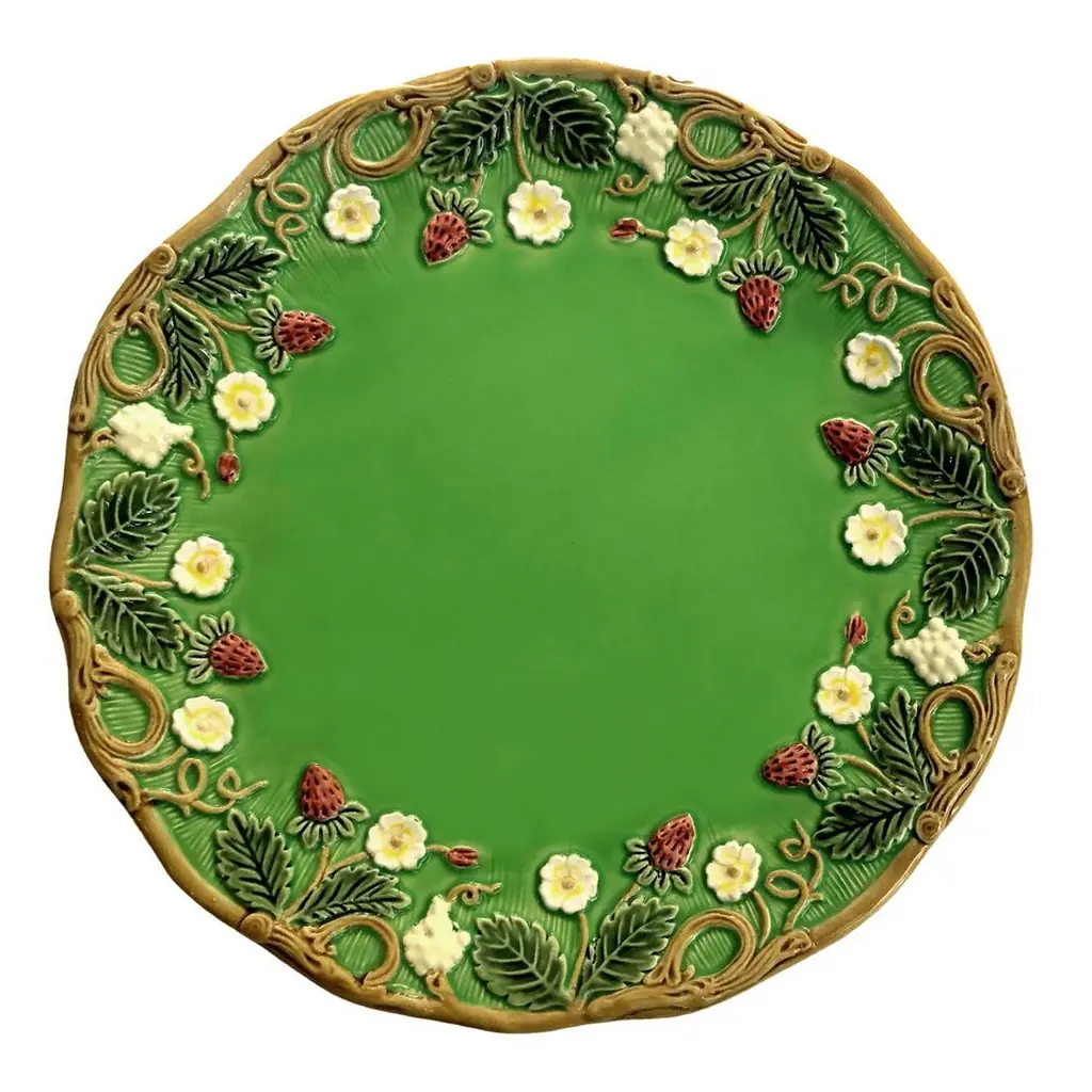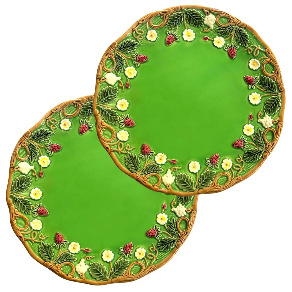 Set of Two green dessert plates from the George Sand Collection.This dessert plate is adorned with a raised pattern of strawberries, strawberry leaves, and small white flowers, carefully arranged around its edge. Its bright, green center creates a harmonious contrast with the natural elements surrounding it. The wavy rim, resembling a wooden branch, adds an artisanal touch. Perfect for showcasing your desserts, this plate’s rustic yet elegant design fits beautifully into festive and sophisticated settings.This unique set of two earthenware dessert plates is part of the George Sand collection, named after the iconic set created by the French manufactory Creil & Montereau for the renowned author George Sand. Inspired by the romantic countryside she cherished, the collection originally featured strawberries and ribbons. With their poetic aesthetic, these plates pay homage to her love for nature. The delicate barbotine grapevine decorations in relief add a refined and artistic element, echoing the spirit of the romantic French author who lived in Nohant-Vic.While these plates are microwave-safe, they are recommended for hand washing only.Available in several colors, the plates can be mixed and matched for a personalized table setting, with other pieces from the same collection sold separately.