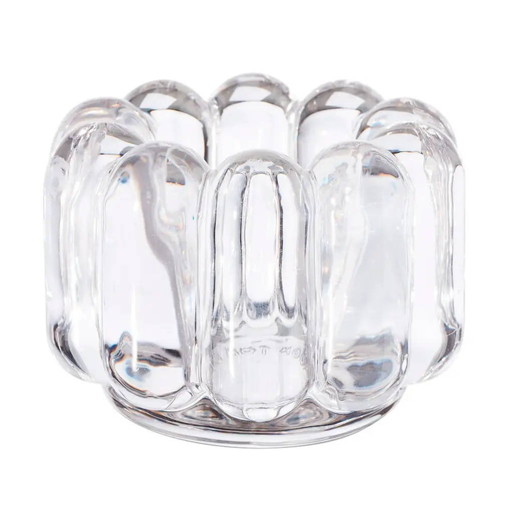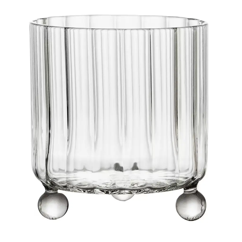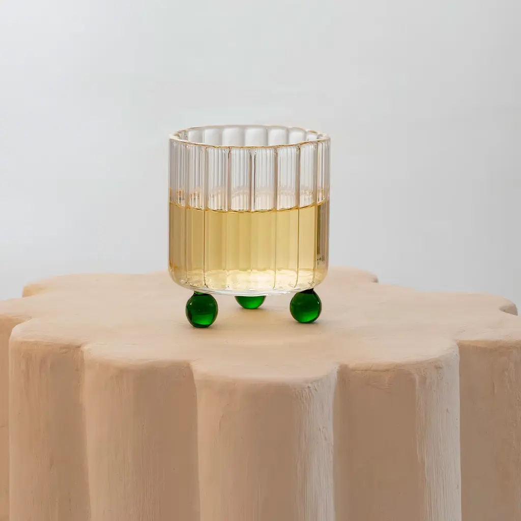 A lowball glass of an atypical shape, inspired by Postmodern architecture. Each piece is handmade in Italy by Master glassblowers, using high-quality borosilicate glass. The ribbed glass body rests on top of three green spheres, playfully elevating any drink. The sculptural design allows for a tilting motion, that encourages appreciating beverages and spirits.