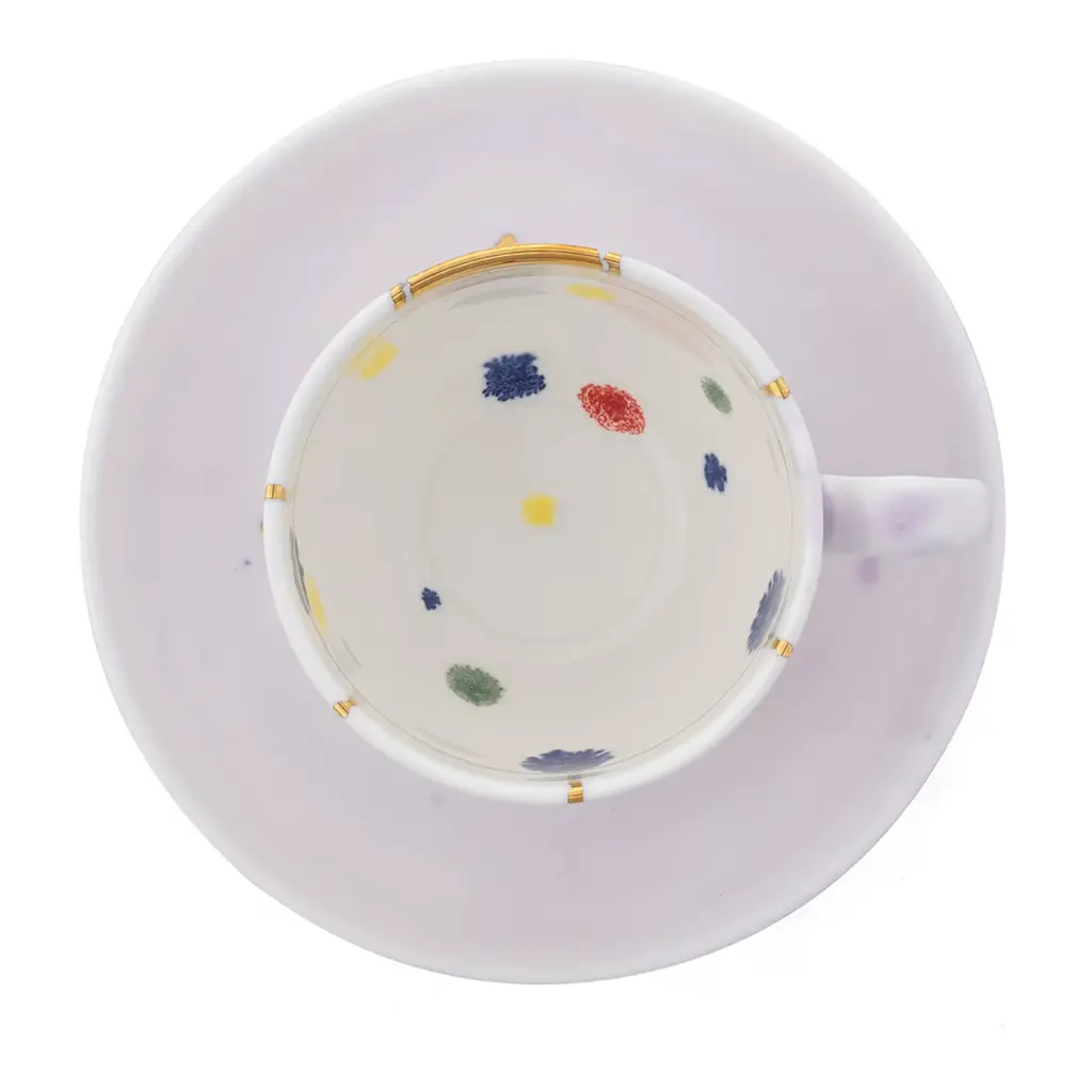 The Islamorada Coffee cup and Saucer from the Florida collection, launched in 2023, beautifully captures the essence of luxury and cheer. Inspired by Florida's vibrant character, this piece feature a soft Islamorada lavender that evokes the tranquility of its sunsets and serene beaches. It is adorned with multicolor dots and a golden net, adding a whimsical touch.