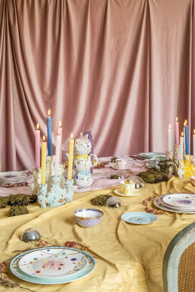 Luxurious and cheerful, the Florida collection was launched in 2023. It is inspired by the American state famous for its strong character and colorful heritage. Each line is characterized by a color. They are inspired by some of the most famous places in Florida, recalling its beaches and its sunsets, stretching between the Gulf of Mexico and the Atlantic Ocean.Palm Beach pink, Miami orange, Amelia green, Naples yellow, Crystal tourqoise, Islamorada lavender.Each plate is decorated with a lightly colored center interspersed with multicolor dots. The rim is richly decorated golden leafs. The charger, tea and coffee cups have are decorated with a golden net- The dessert plates and teapots have a distinct design characterized by golden rays crisscrossing their surface.